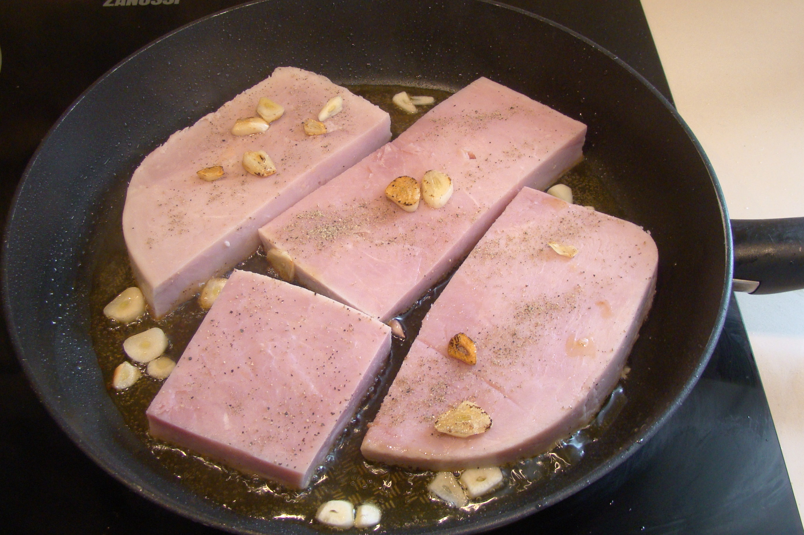 INGREDIENTES: 3 tallos de col abierta, 3 pimientos dulces, 2 dientes de ajo, 300 gramos de jamón york y 2 cucharadita de aceite de oliva virgen.