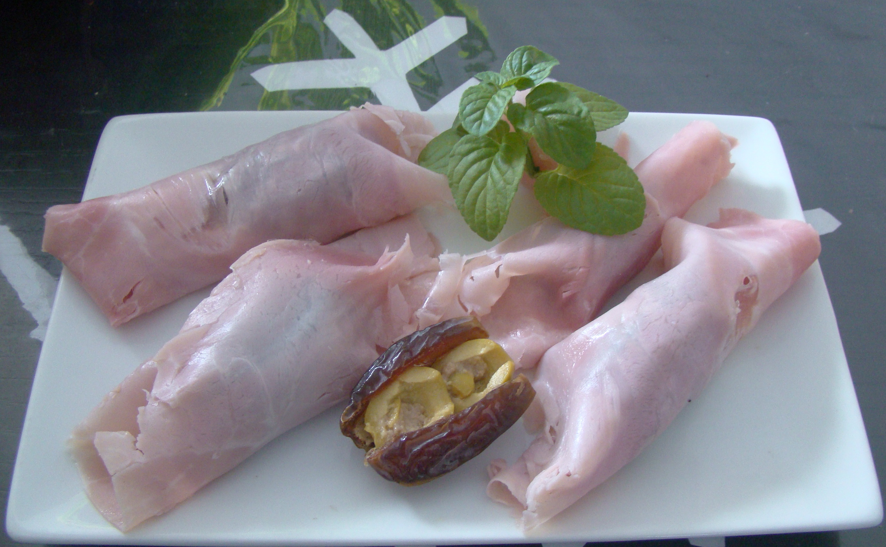 INGREDIENTES: jamón york, aceitunas rellenas de anchoas y dátiles.