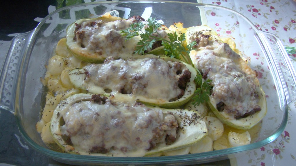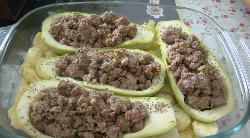INGREDIENTES: 2 calabacines, 150 gramos de carne de res y150 gramos de cochino, 4 dientes de ajo, 1 cucharada de aceite de oliva, queso gouda, cúrcuma, pimienta blanca , pimienta negra, tomillo seco y orégano.