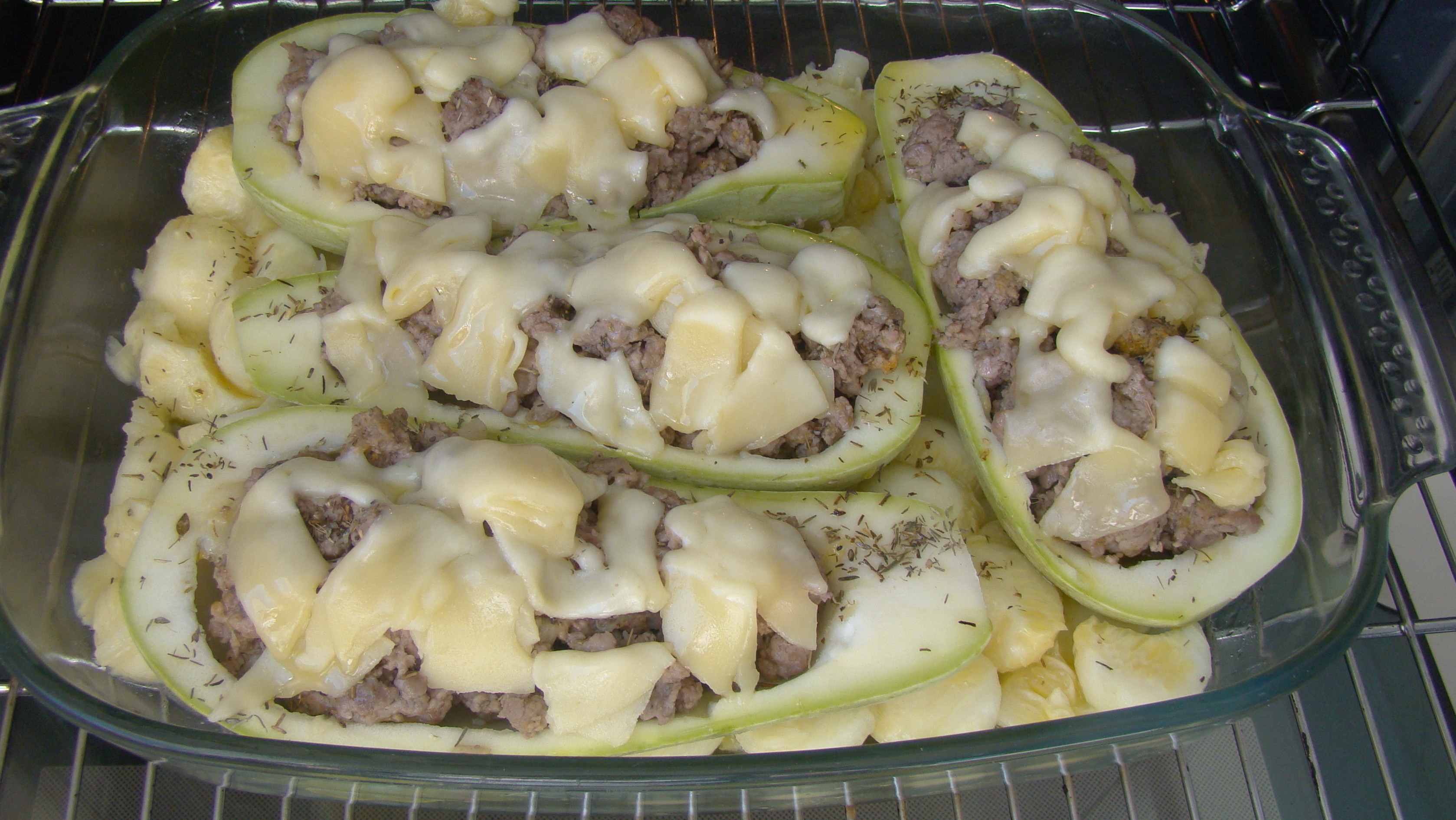 PREPARACIÓN: vaciamos el calabacín, sofreímos la pulpa y la ponemos en la bandeja donde vamos a hornear los calabacines. . Ponemos el aceite en la sartén y sofreímos los ajos, añadimos la carne, las especias, mezclamos y apartamos; rellenamos los calabacines y los cubrimos con las lonchas de queso partidas en trocitos y esparcimos el tomillo por encima. Los colocamos encima de la pulpa que tenemos en la bandeja. Con el horno precalentado a 200º, en el momento de poner la bandeja, bajamos a 180º y mantenemos durante 30 minutos. Al sacarlo, esparcimos por encima el orégano.