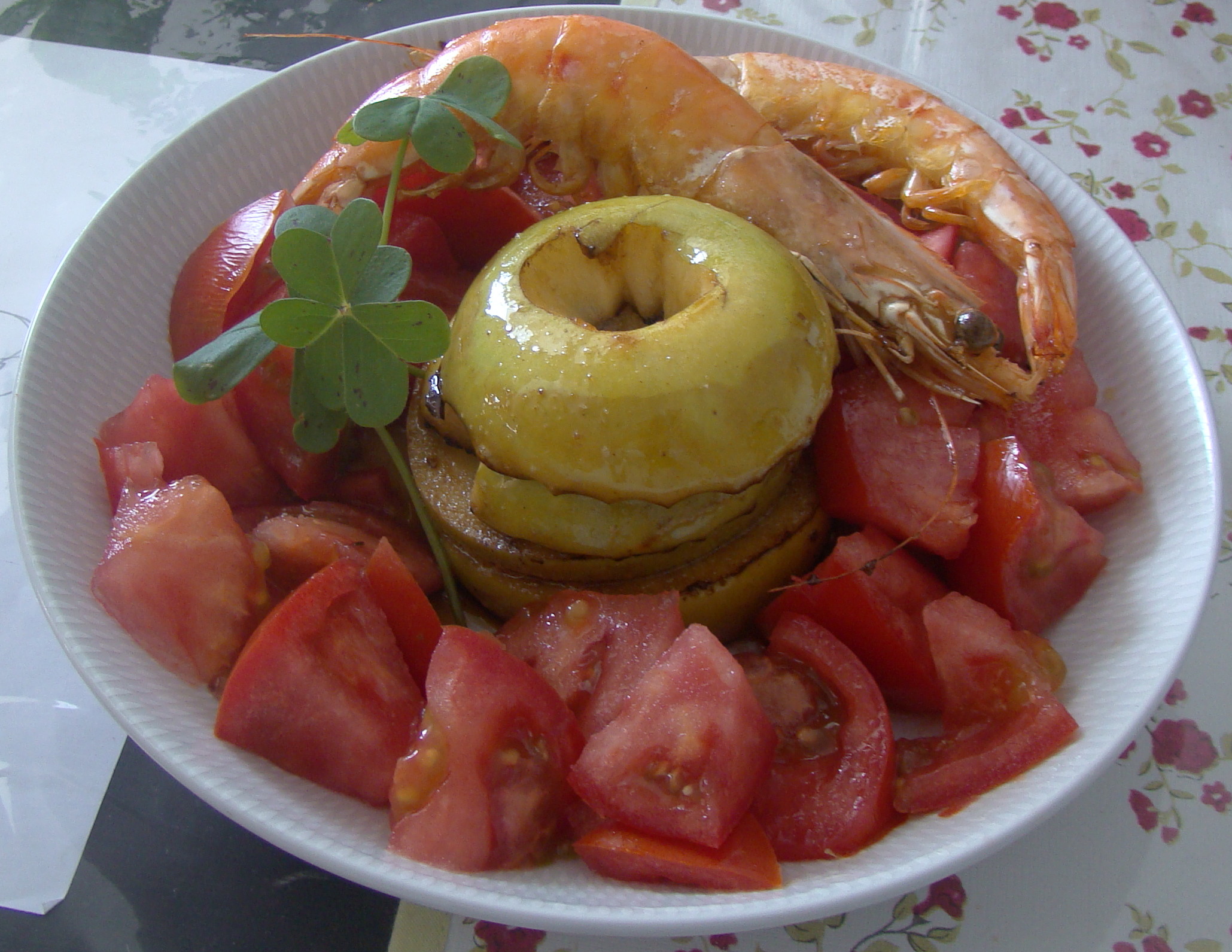 INGREDIENTES: 1 tomate, 1 manzana, sal al gusto, 1 cucharada de aceite de oliva y gambas.
