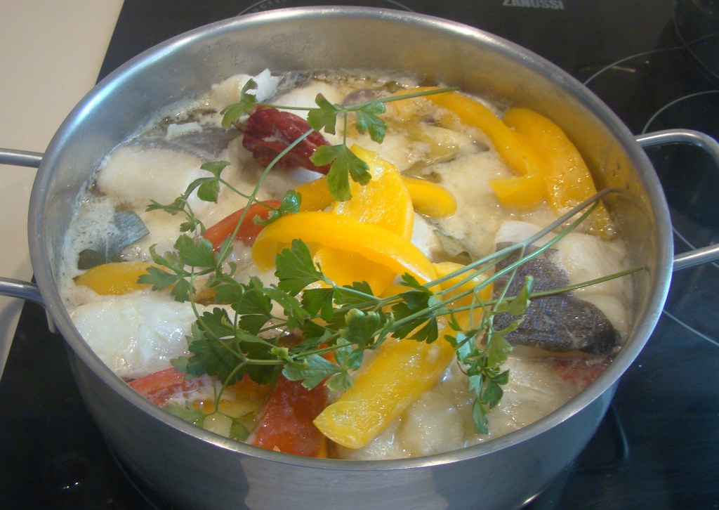 INGREDIENTES: 3 lomos de bacalao a punto de sal, 1 pimiento rojo, 1 pimiento amarillo, 1 trozo de puerro, 1 cebolla roja, 4 papas, 2 hojas de laurel, 1 cucharada de aceite de oliva, 2 vasos de agua y 2 cucharadas de Brandy