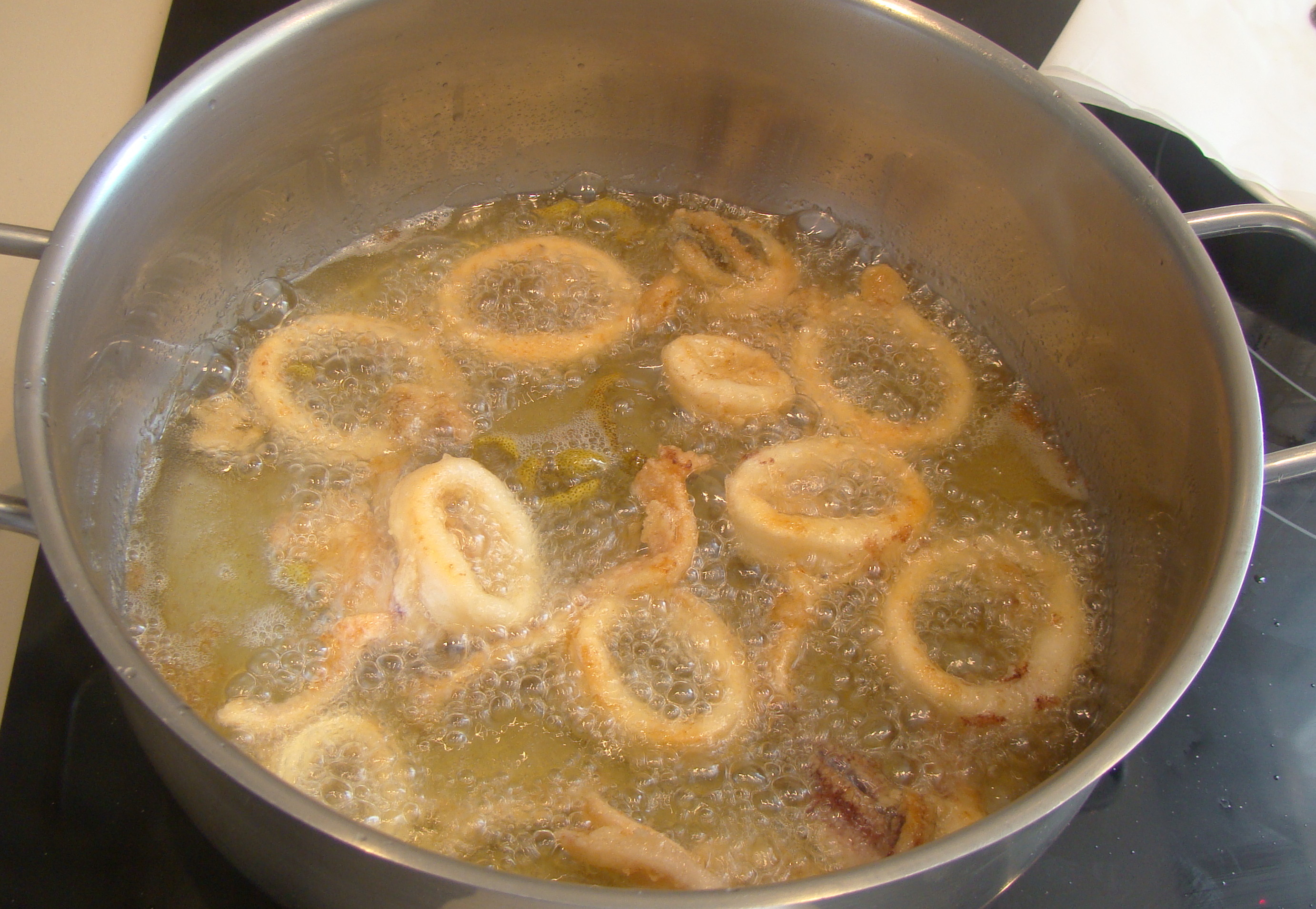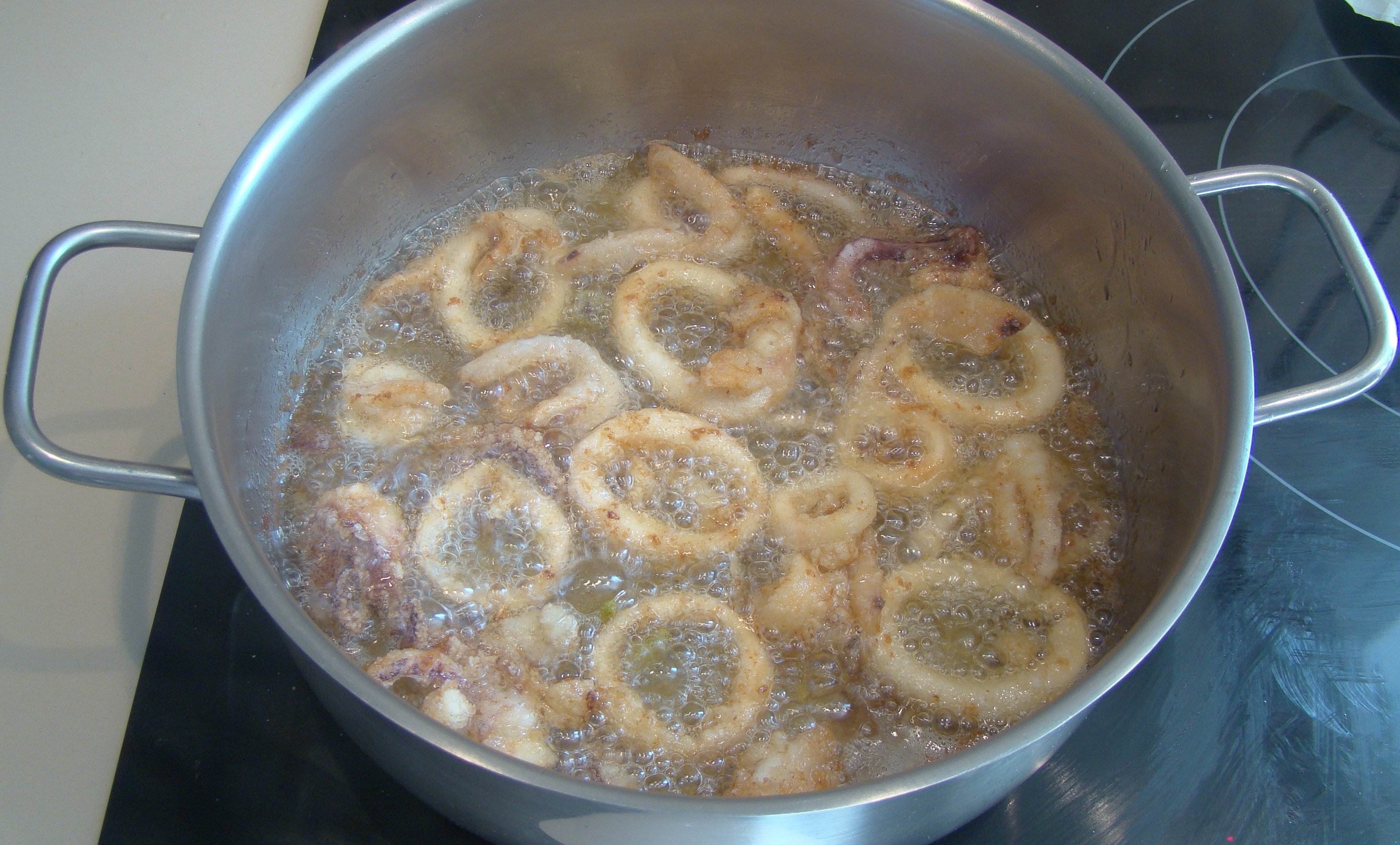 INGREDIENTES: 2 calamares frescos, ( 450 gramos aproximadamente, nos lo pueden preparar cortados en la pescadería), 1 cucharadita de sal fina, 3 cucharadas de harina de arroz, 3 cucharadas de harina de trigo, la piel de 1 limón (lo verde) y aceite de millo que los cubra.