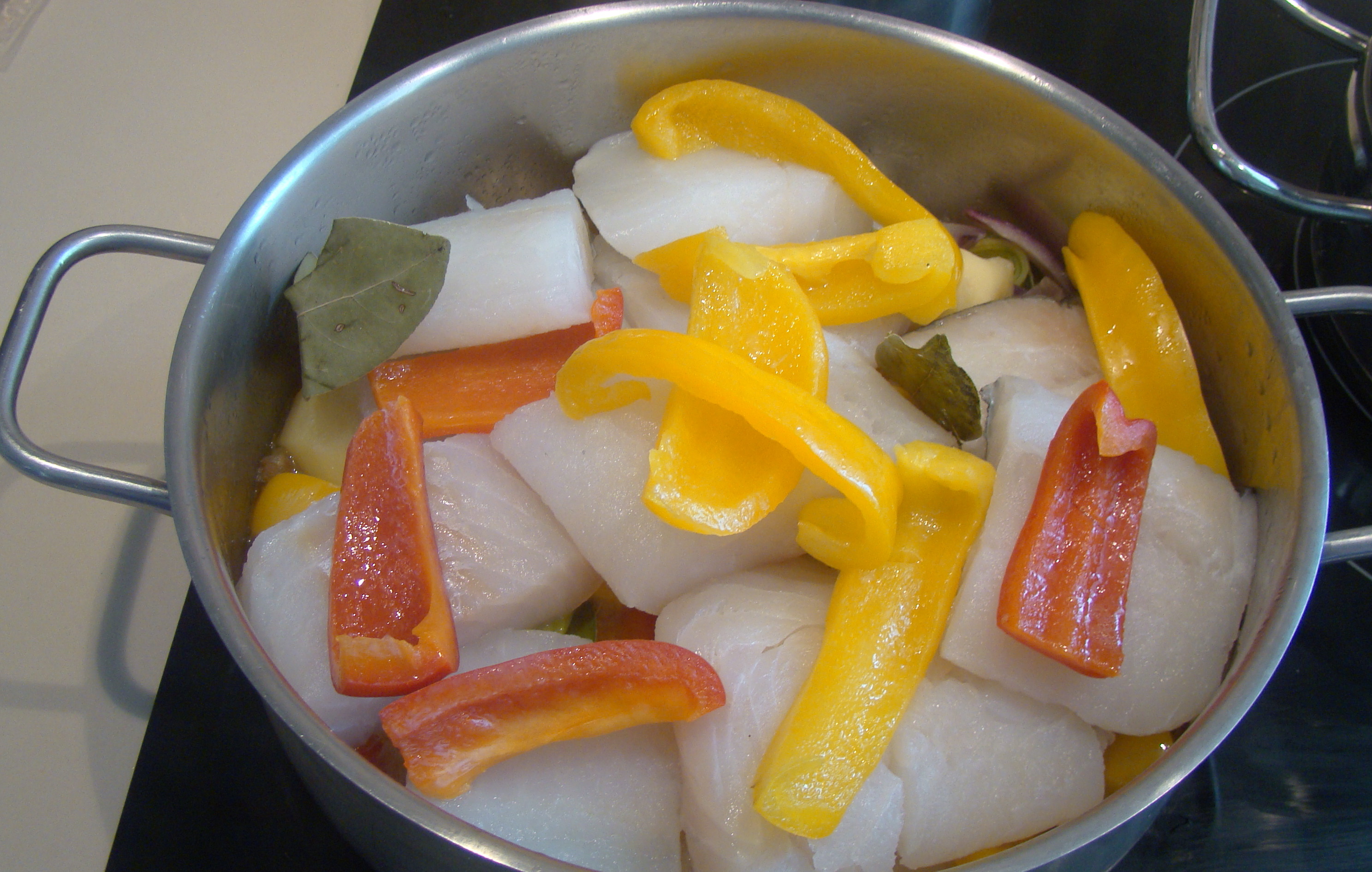 INGREDIENTES: 3 lomos de bacalao a punto de sal, 1 pimiento rojo, 1 pimiento amarillo, 1 trozo de puerro, 1 cebolla roja, 4 papas, 2 hojas de laurel, 1 cucharada de aceite de oliva, 2 vasos de agua y 2 cucharadas de Brandy