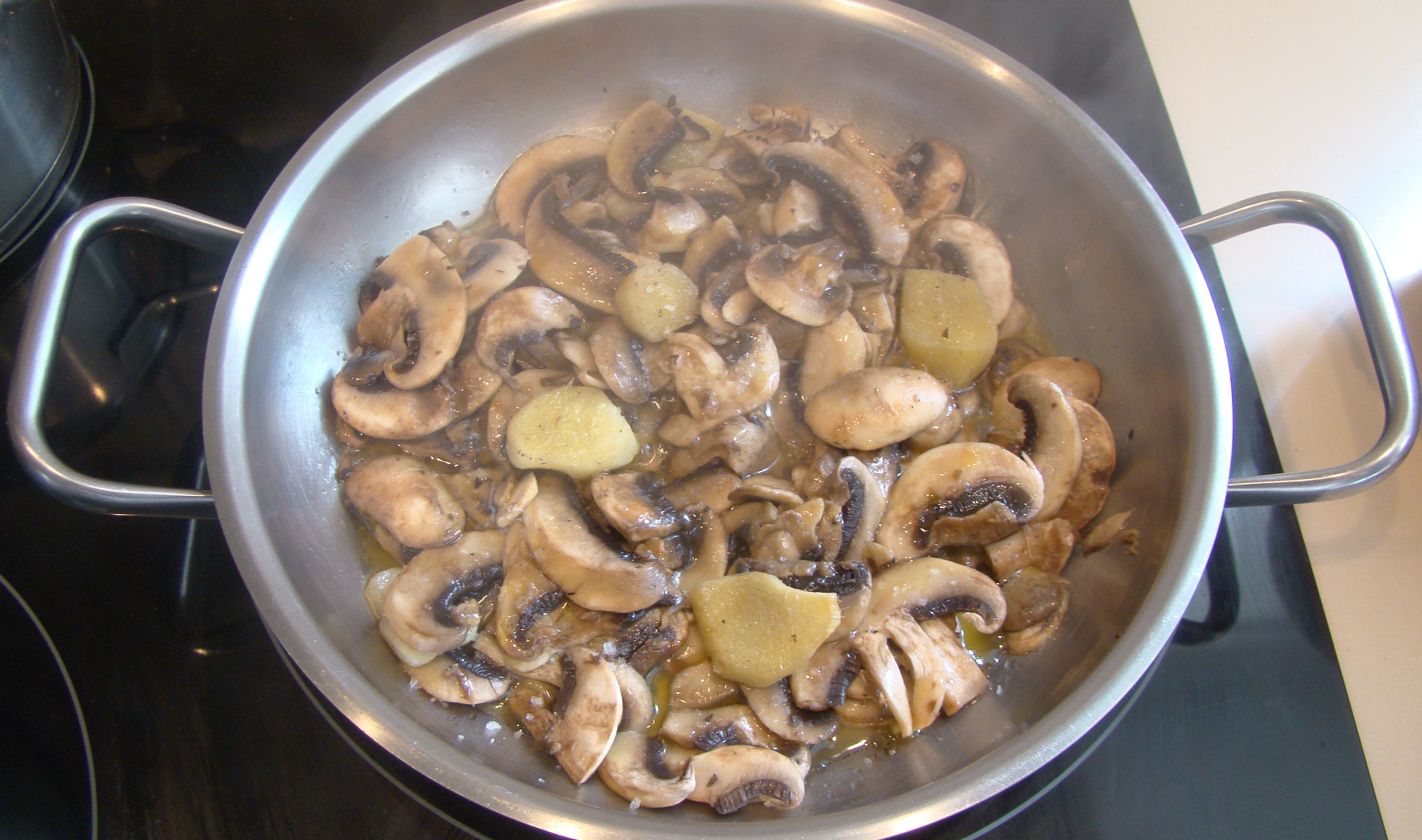 PREPARACIÓN: pelamos y picamos los ajos y los champiñones (los limpiamos con servilleta o paño húmedo para evitar lavarlos bajo el grifo). Ponemos el aceite a calentar en un caldero plano, doramos los ajos, añadimos las setas y el jengibre, removemos mezclando unos minutos, salpimentamos y apartamos.