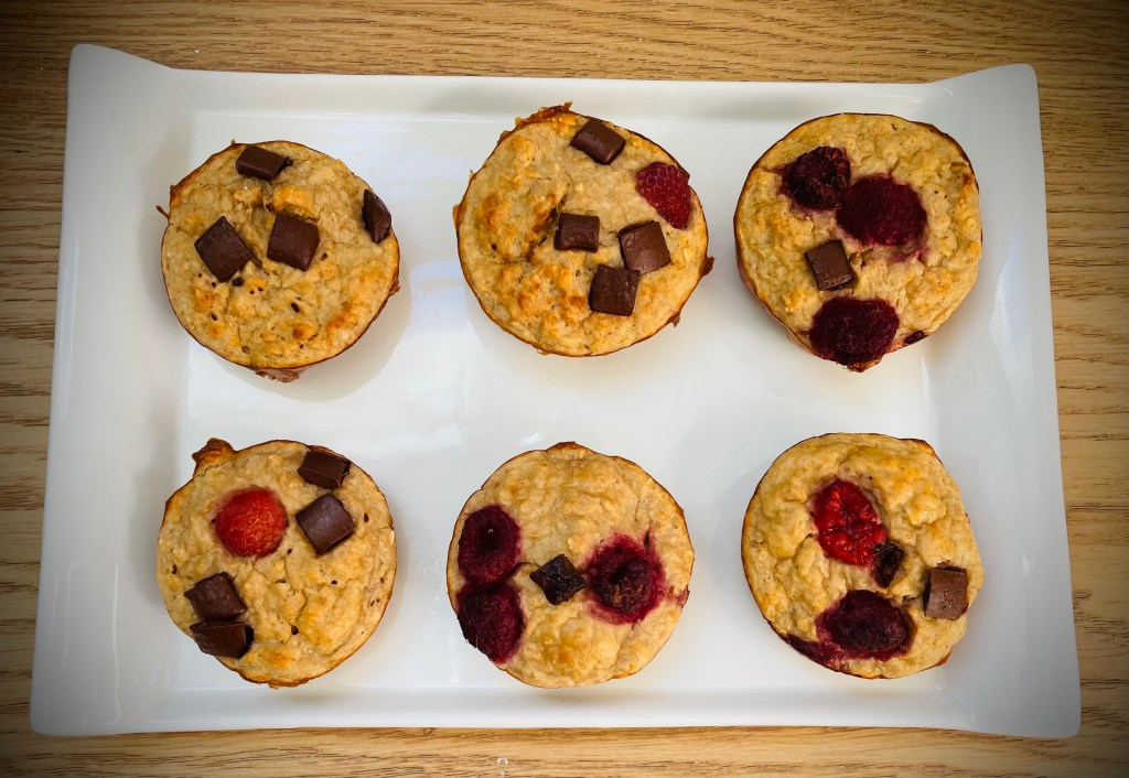PREPARACIÓN: batimos los plátanos escachados y los huevos, añadimos la avena y el yogur revolviendo bien. Ponemos en los moldes, decoramos con chocolate y/o frambuesas y horneamos entre 15 y 20 minutos a 200ºC con el horno previamente calentado.