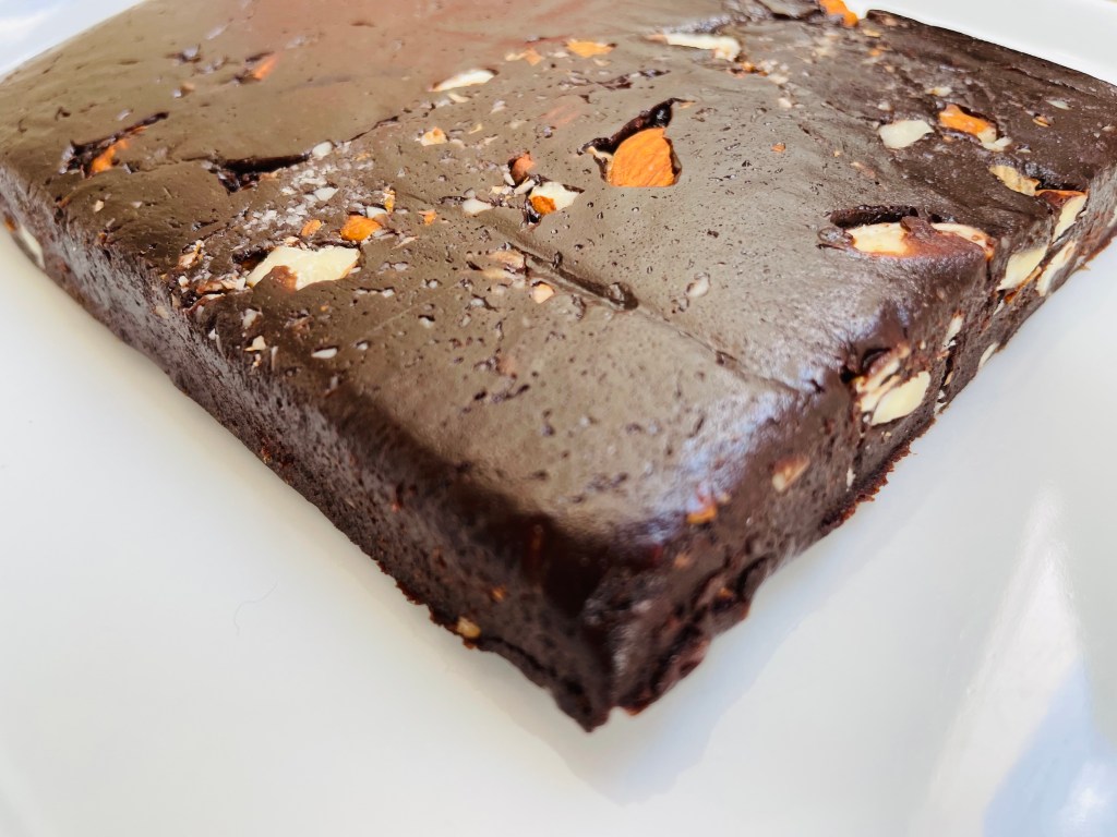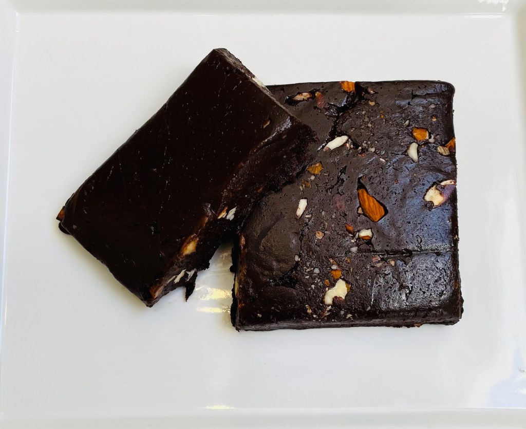 INGREDIENTES: 220 g de dátiles deshuesados, 100 g de nueces, 70 g de cacao en polvo sin azúcar, 1/4 de cucharadita de sal, 3 cucharadas de sirope de agave, 40 g de almendras crudas, sin tostar y sin sal en trozos.