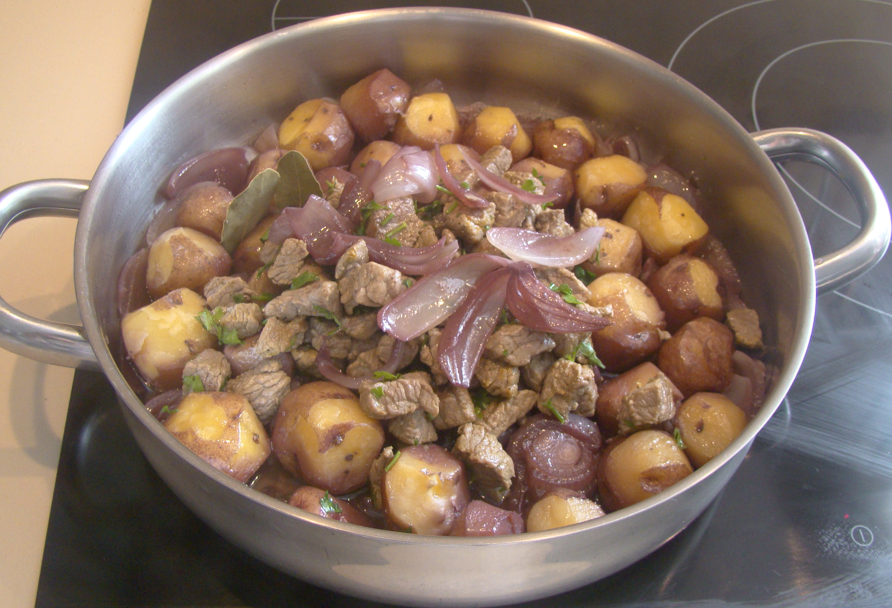 INGREDIENTES: 1/2 kilo de carne de lomo cortadita, 20 papas azucenas pequeñas, 3 cucharadas de aceite de oliva, 2 cebollas blancas, 4 dientes de ajo, 3 cucharadas de Brandy, varias especias cúrcuma, pimienta negra molida, pimienta blanca molida, 1 pisca de comino molido, 2 hojas de laurel, 1/2 vaso de vino tinto y sal al gusto.