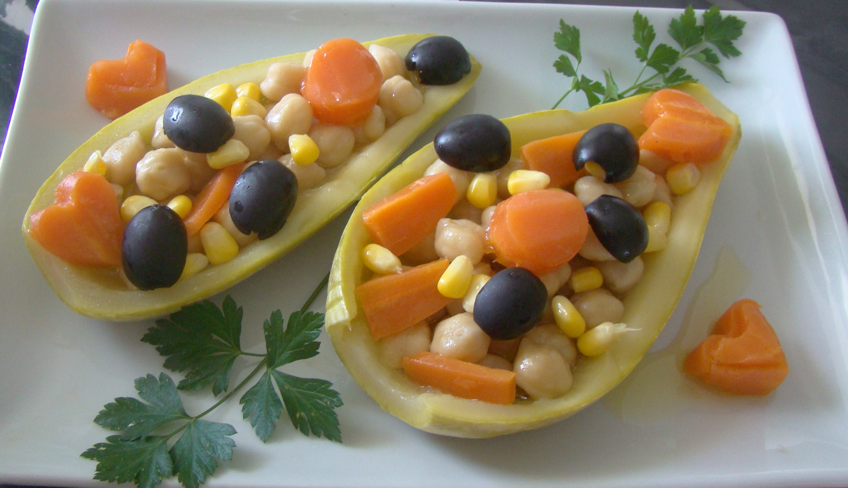 INGREDIENTES: 1 calabacín, 1/2 vaso de garbanzos, 1 piña de millo fresca, 1 zanahoria, 1/2 cucharada de aceite de oliva virgen, 1 cucharadita de vinagre de vino y aceitunas y sal al gusto.