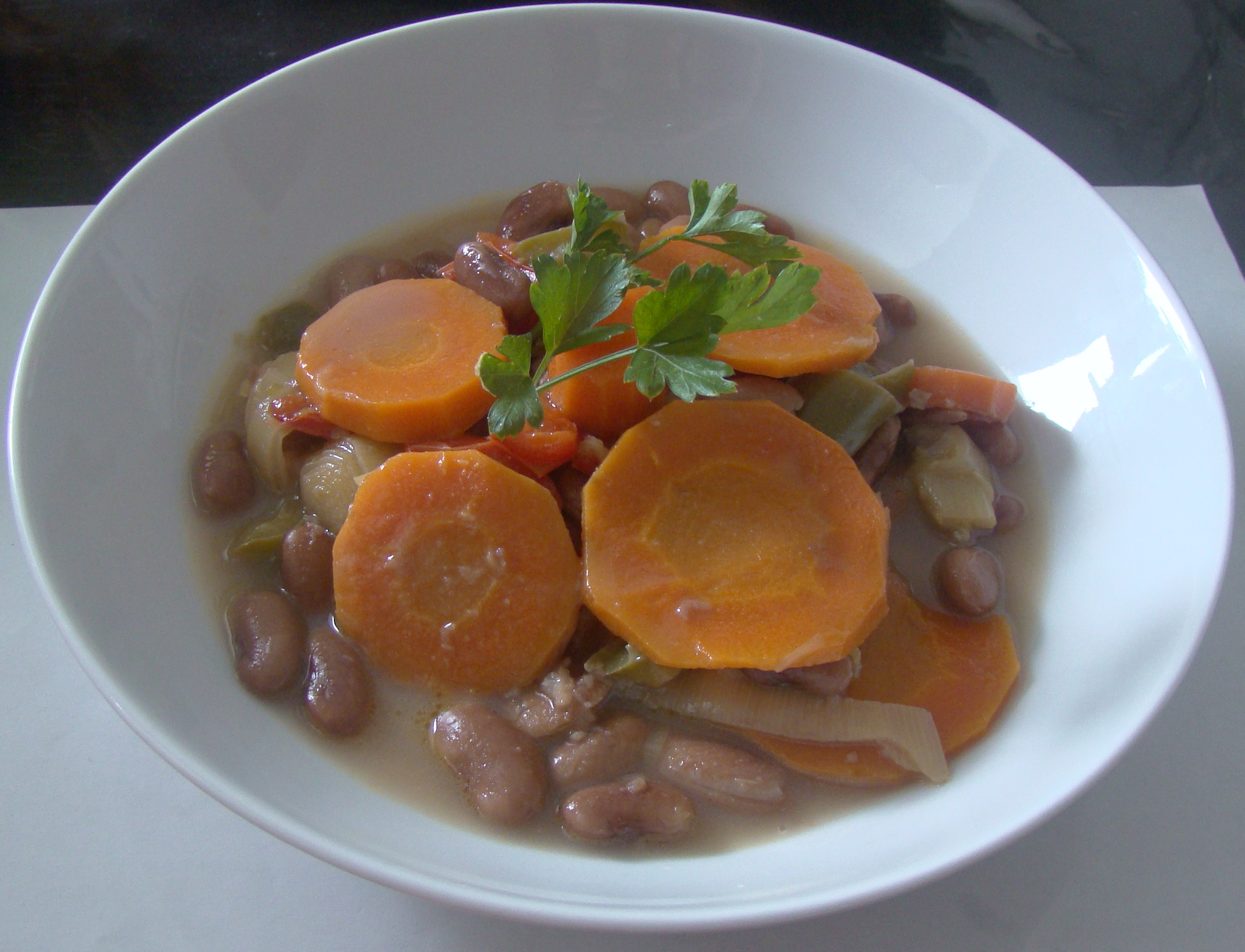 INGREDIENTES: 1/2 kg. de judías pardas, 1 puerro, 1/2 cebolla roja, 1 pimiento rojo, 1 pimiento verde, 1 zanahoria, 4 dientes de ajo, 1 cucharada de aceite de oliva, 1 cucharada de Ron, 2 hojas de laurel y sal al gusto.