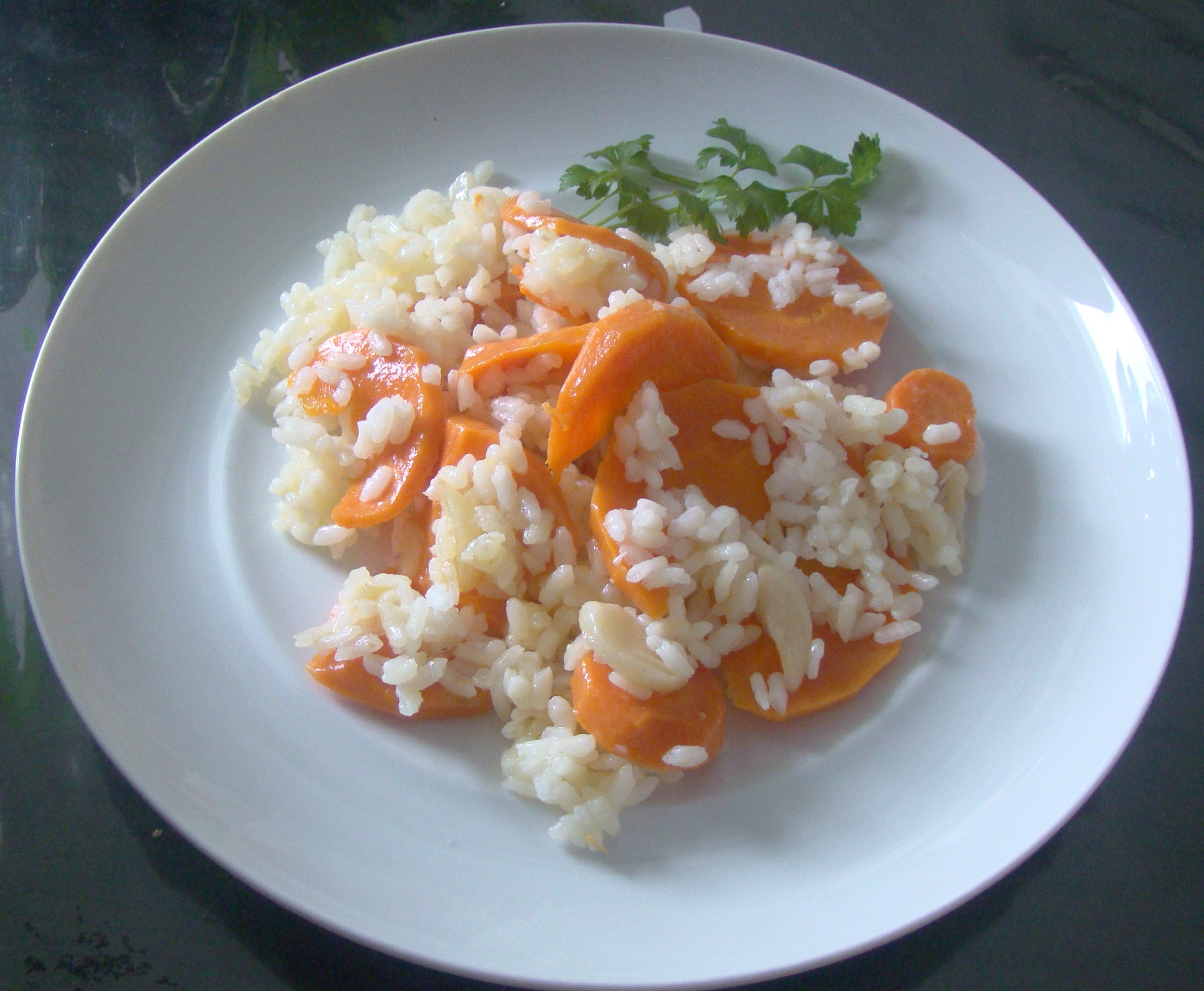 INGREDIENTES: 1 vaso de arroz, 1 zanahoria, 3 dientes de ajos, 1 cucharadita de aceite de oliva virgen y sal al gusto.
