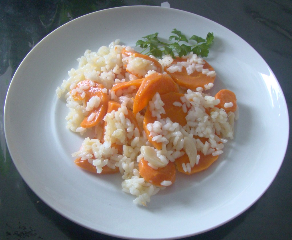 PREPARACIÓN: hacemos un sofrito con los ajos y la zanahoria pelados y picados. Lavamos el arroz, lo añadimos removemos y añadimos el agua (3 medidas de agua por una de arroz). Cuando rompe el hervor, mantenemos a fuego bajo hasta a se reduzca el agua (es importante no esperar hasta que esté completamente seco). Tapamos con un paño y la tapa mientras preparamos la mesa para a quede al dente.