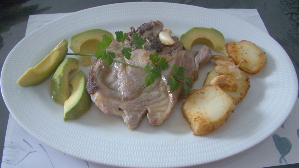 INGREDIENTES: 1 chuleta, 2 aguacates, 2 papas, 4 dientes de ajo y 1 cucharadita de aceite de oliva virgen.