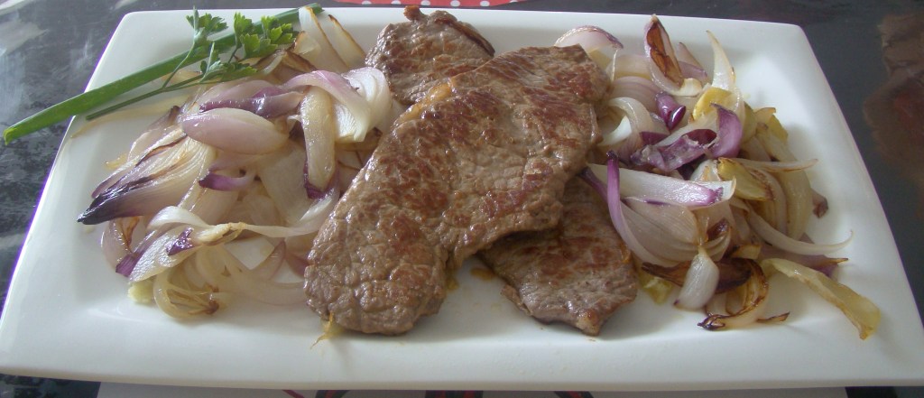 INGREDIENTES: 2 cebollas 1 blanca otra roja un trozo de jengibre fresco, 1 cucharada de aceite de oliva, 2 bistec y la sal al gusto.