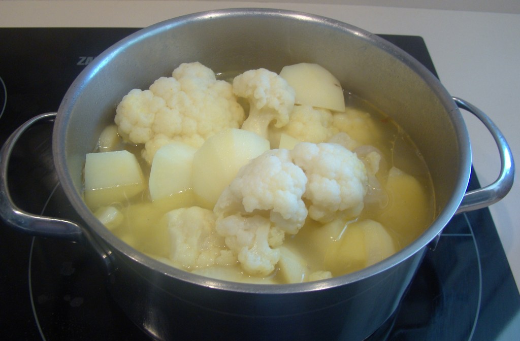 INGREDIENTES: 1 coliflor mediana, 4 papas, 1 bubango pequeño, 3 dientes de ajo, 1 cucharadita de aceite de oliva virgen, sal y un manojo de espinacas.
