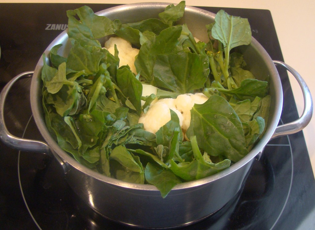 PREPARACIÓN: ponemos en un caldero el aceite y los ajos. Cuando estén dorados, añadimos las papas, el bubango, la coliflor, agua (que casi cubra las verduras) y sal y seguimos el cocinado durante treinta minutos. Por último, añadimos las hojas de espinacas y apartamos del fuego. Removemos y trituramos.