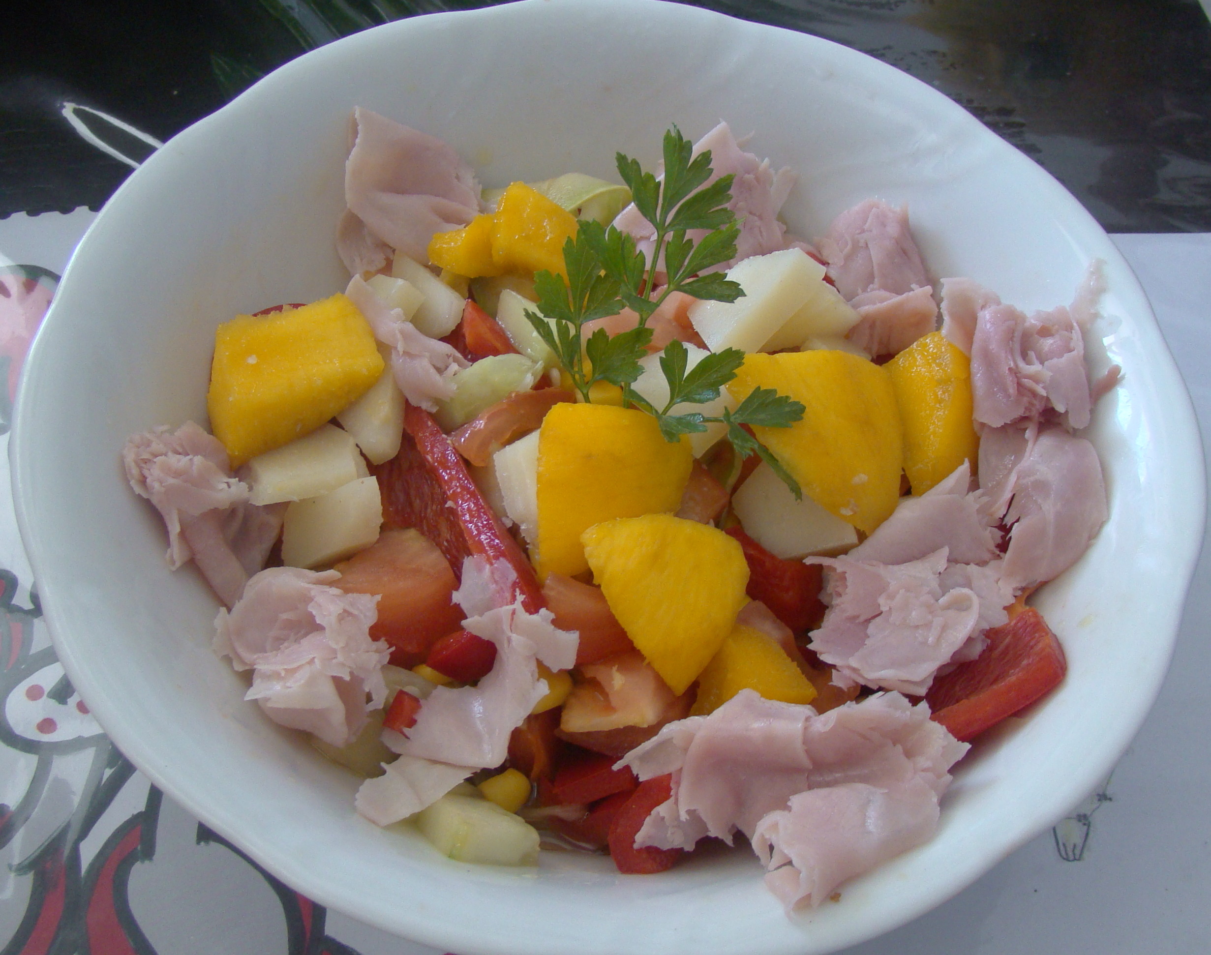 PREPARACIÓN: pelamos el pepino, el tomate, el pimiento, la manga y cortamos en trocitos , añadimos el millo, el jamón cortado en trocitos y al momento de servir añadimos el aceite y vinagre al gusto.