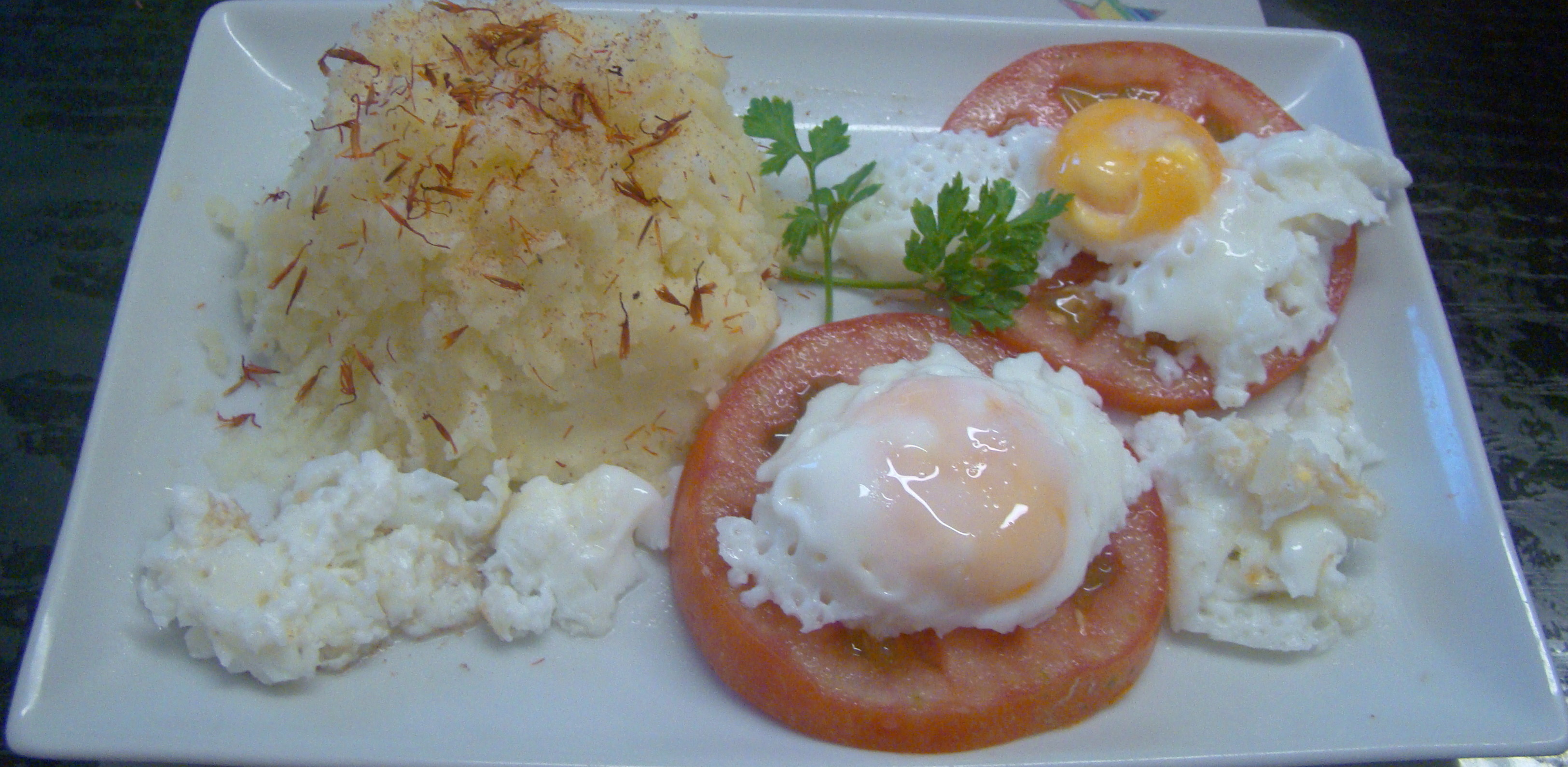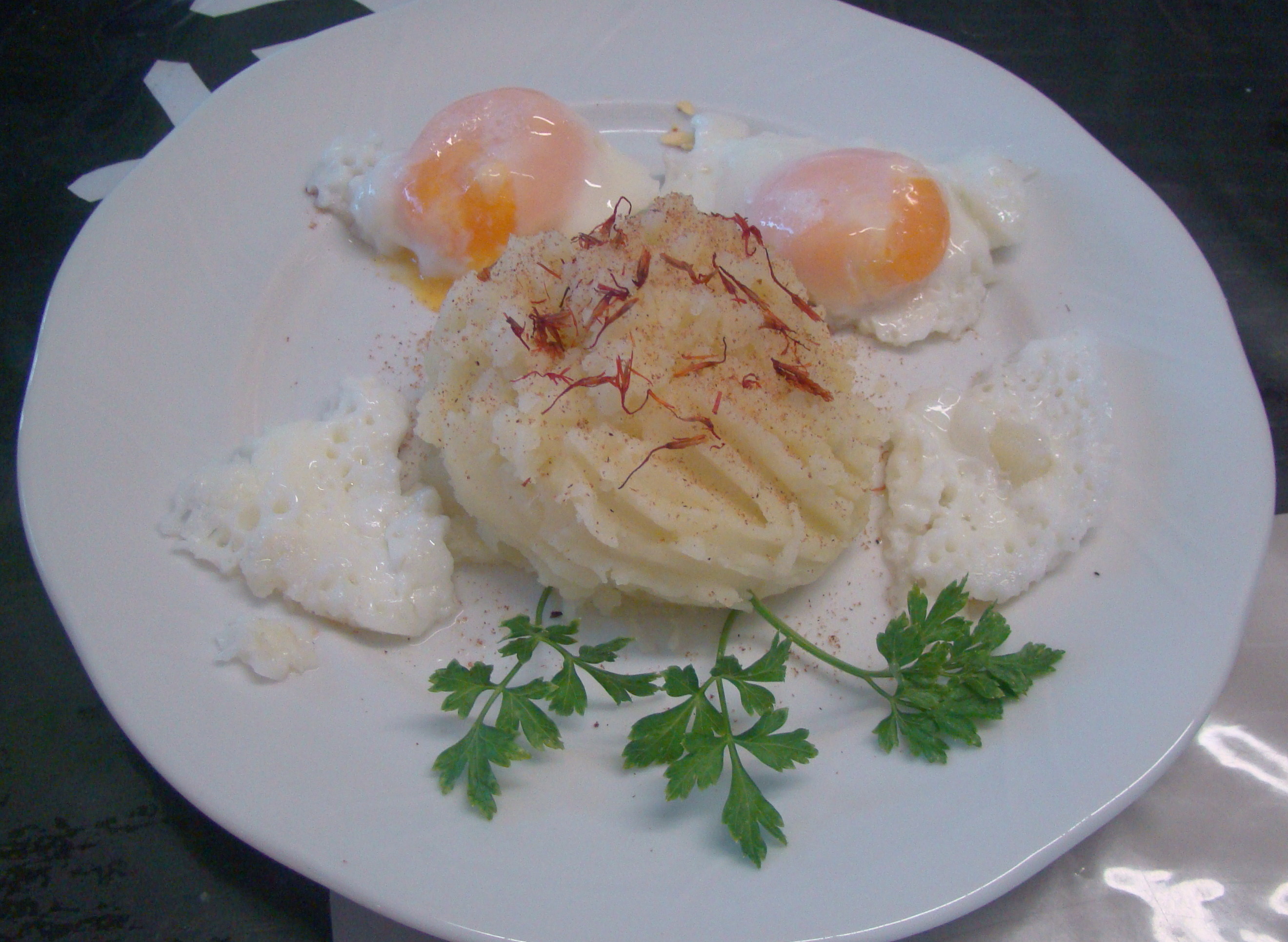 PREPARACIÓN: pelamos las papas y las cortamos en láminas. Las guisamos en el agua justa para que las cubra y un pizca de sal unos 15-20′. Las escurrimos (reservando el agua) y las escachamos con un tenedor y les añadimos el aceite y la nuez moscada. En el agua de las papas hacemos los huevos escalfados: cascamos el huevo en un taza de café y ponemos agua a hervir. Cuando esté a punto de hervir, hacemos un remolino de agua con una cucharita y dejamos caer el huevo en él. Cocemos sin que llegue a hervir unos 3 minutos. Emplatamos haciendo una montañita con las papas, espolvoreamos el azafrán, añadimos los huevos y a comer.