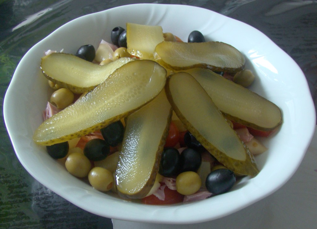 PREPARACIÓN: lavamos y pelamos el tomate, el pepino y la cebolla. Cortamos todo en trocitos, y lo vamos emplatando, añadiendo las aceitunas (cantidad al gusto) y los pepinillos en láminas. En el momento de servir, añadimos el vinagre y el aceite.