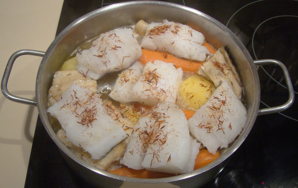 INGREDIENTES: unos trocitos de pescado salado, 1 trozo de bacalao, 3 cebollas, 6 dientes de ajo, 4 zanahorias, 12 papas, 1 cucharada de aceite de oliva, agua que cubra los ingredientes, 1 cucharada de azafrán y sal al gusto.