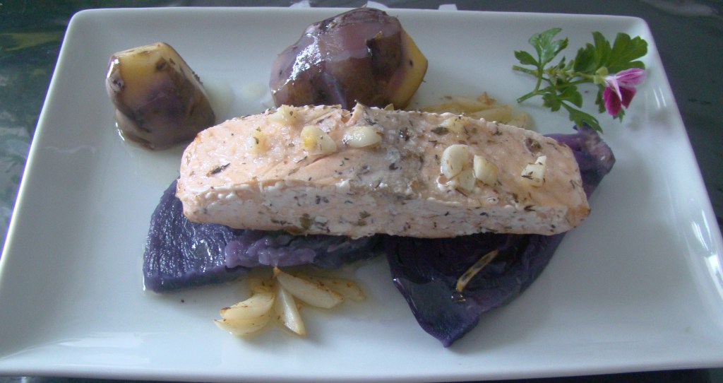 INGREDIENTES: salmón, col cerrada morada, ajos, aceite de oliva virgen, papas azucenas y sal.