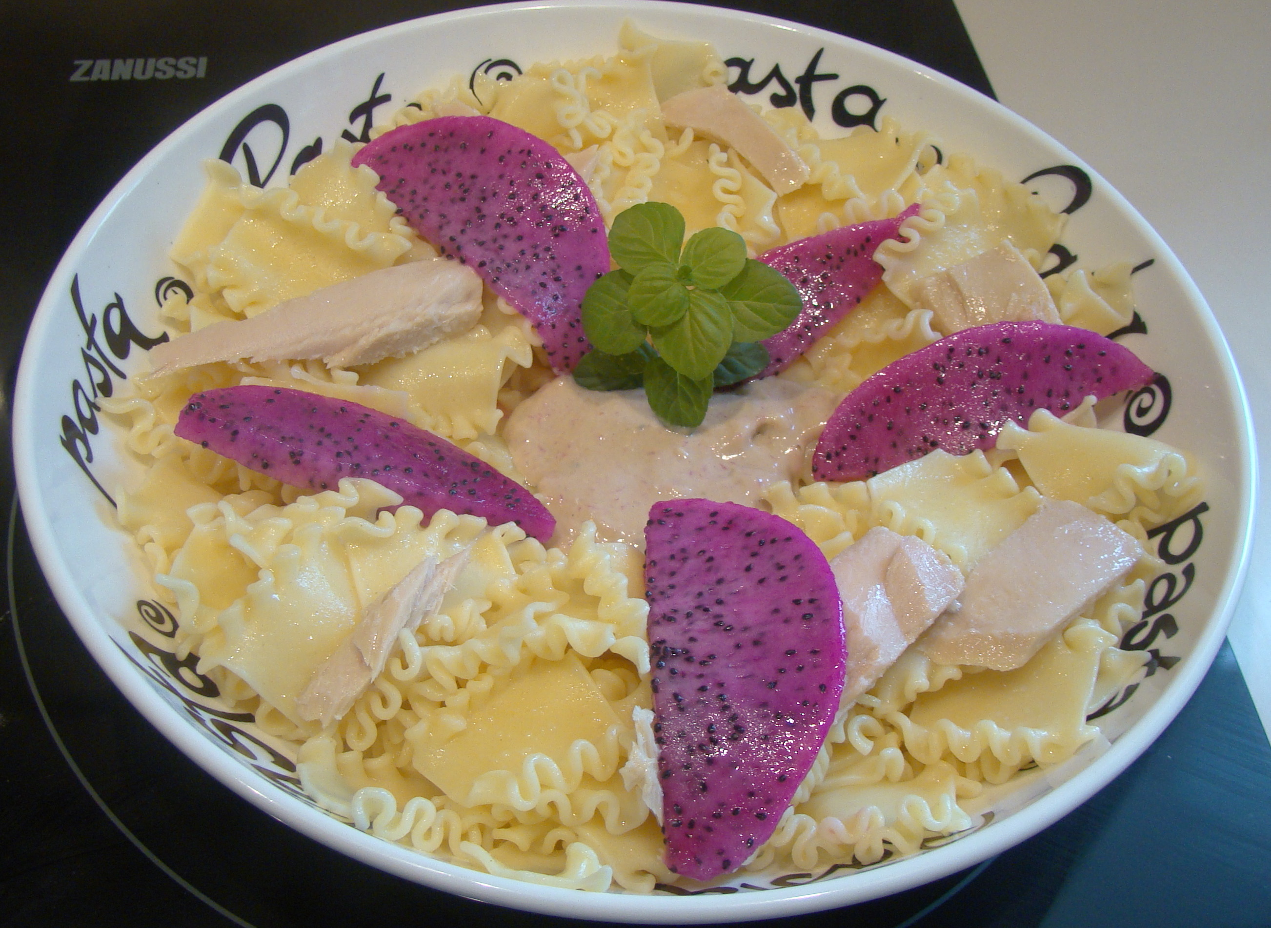 INGREDIENTES: 1 vaso de pasta, 1 lata de bonito en aceite de oliva,1 pitahaya, 1 cucharada raza de aceite de oliva y sal al gusto.