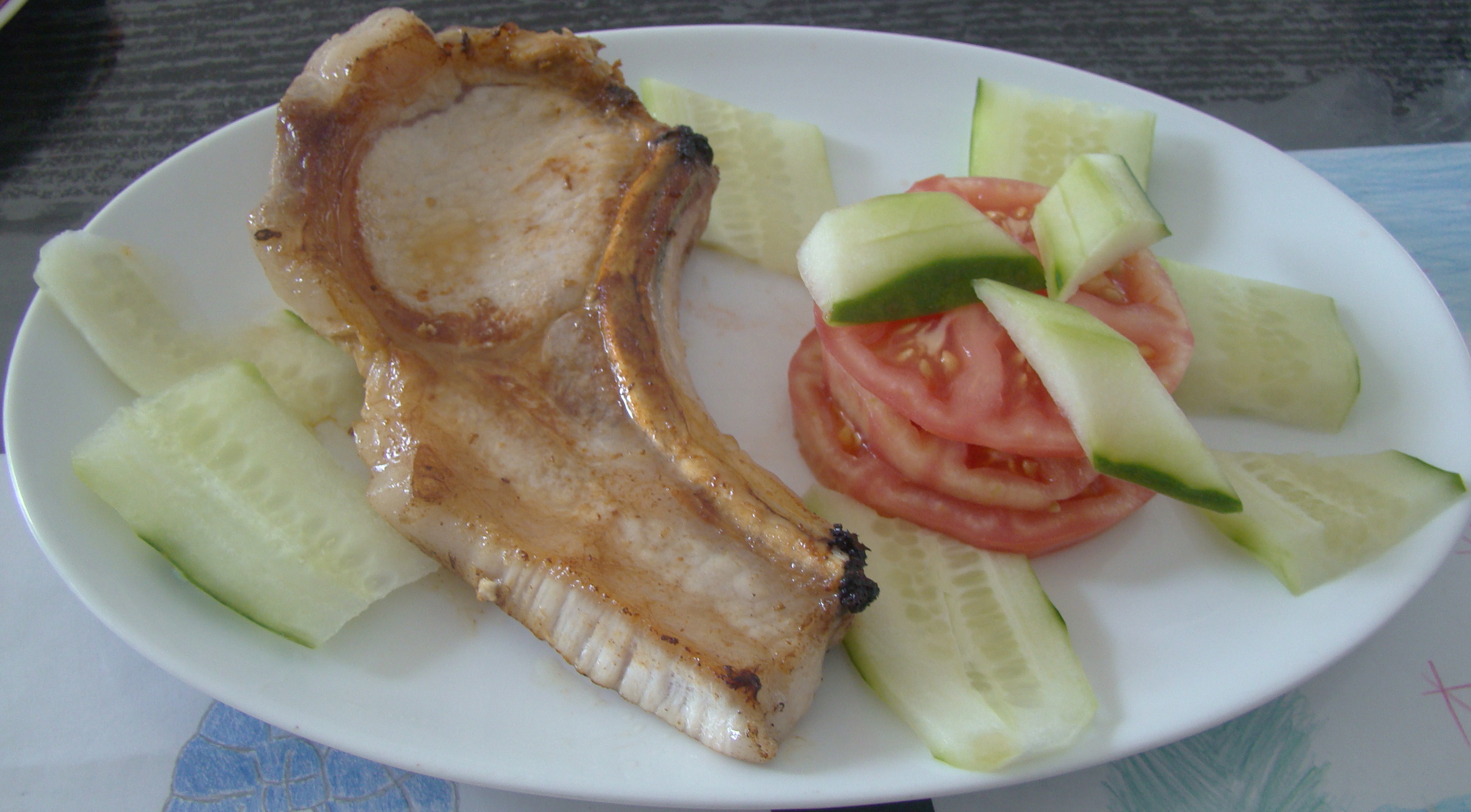 PREPARACIÓN: guisamos las papas con un puñadito de sal. Estarán listas en 20 minutos. Emplatamos con el pepino pelado y el tomate, cortado. Asamos la carne en una cucharadita de aceite de oliva virgen: la marcamos a fuego medio alto y luego lo bajamos hasta que esté hecha. Le añadimos la sal al sacarla (un pellizco por chuleta aproximadamente).