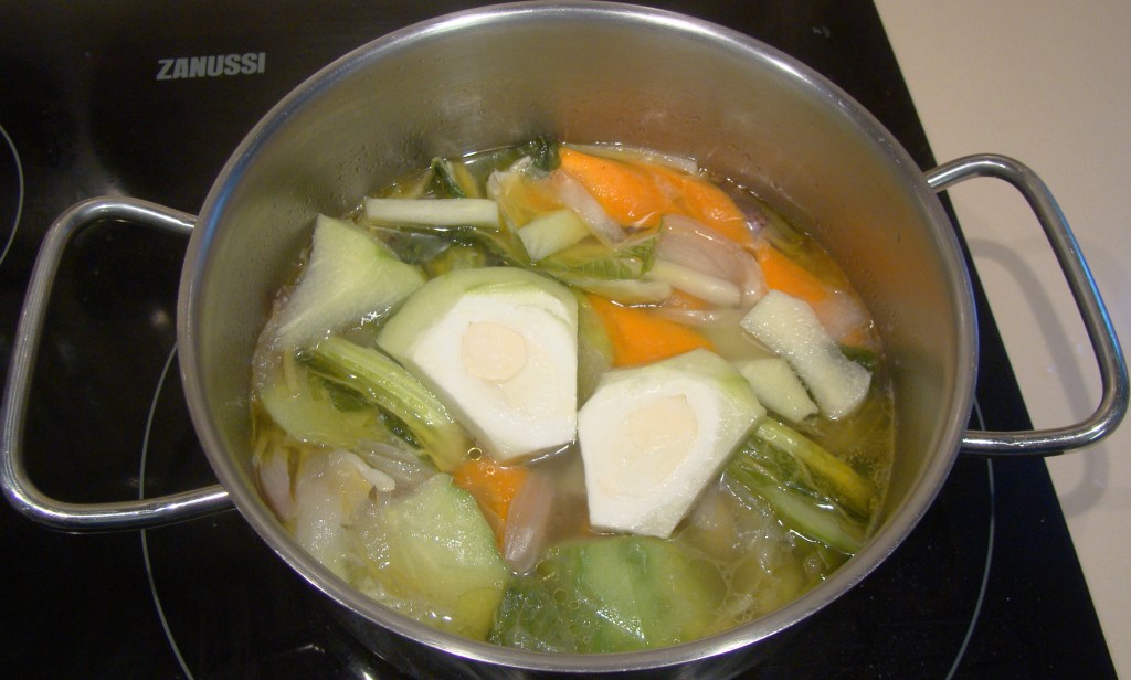 INGREDIENTES: 2 chayotas, 1 zanahoria, 1 cebolla pequeña, 2 dientes de ajos, 1 cucharadita de aceite de oliva, varias hojas de coliflor y sal al gusto.