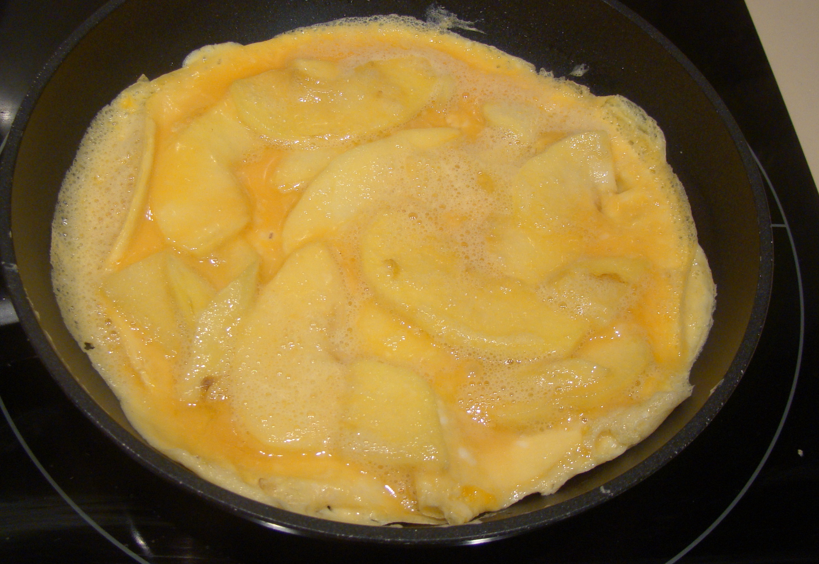 PREPARACIÓN: ponemos los huevos en una sartén pequeña (adecuada) con la cucharadita de agua y la sal batimos, en otro sartén asamos la manzana cortada en gomos finos añadimos y así nos quedo de rica la tortilla.