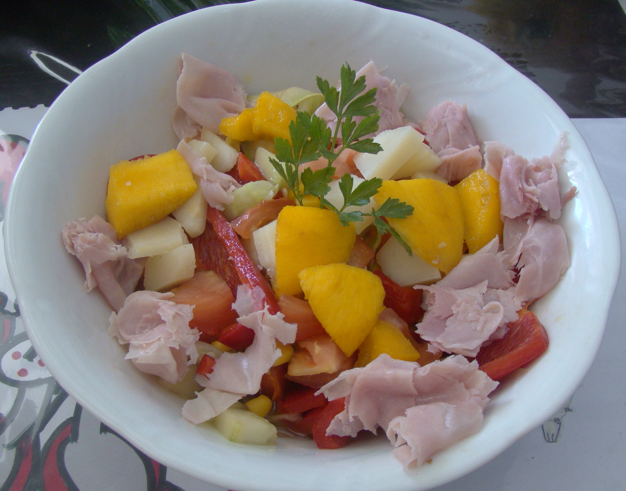 PREPARACIÓN: pelamos y cortamos la manga en trocitos, igual el pimiento, el tomate, el queso y el jamón y añadimos el millo escurrido. Al momento de servir, aliñamos con el aceite y el vinagre según gusto.