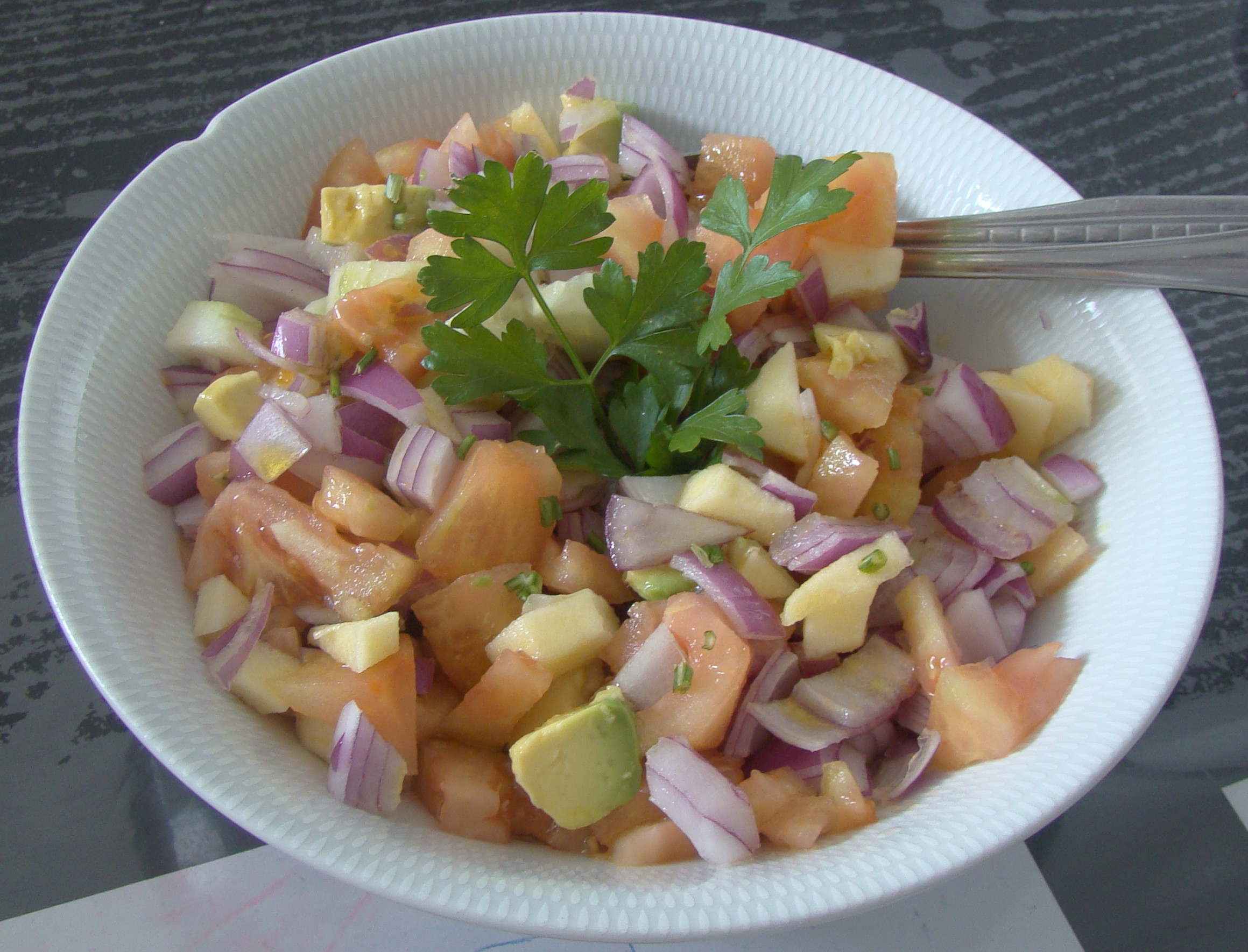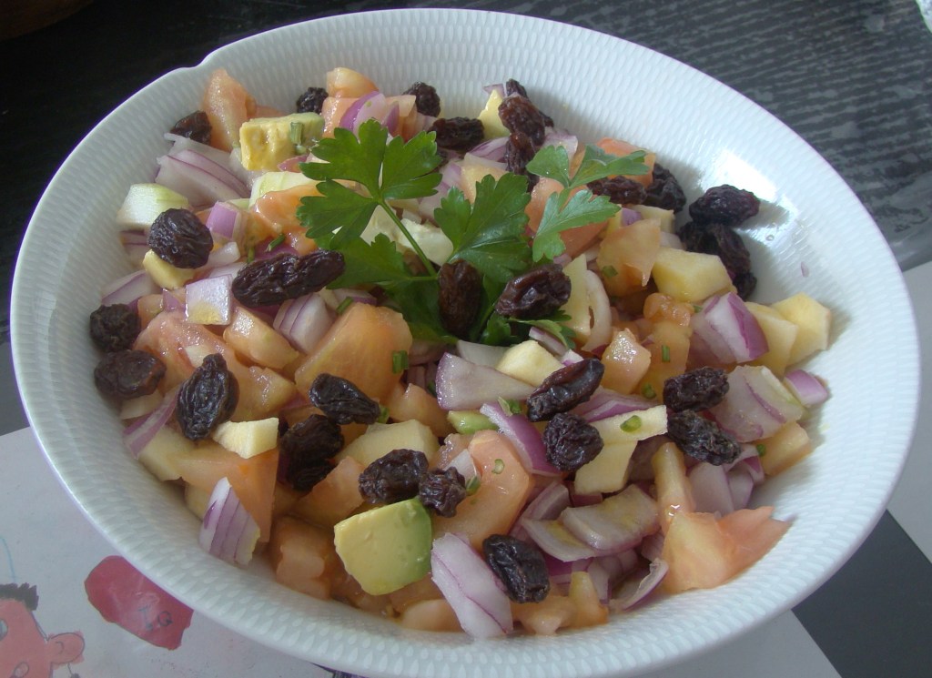 PREPARACIÓN: pelamos el aguacate ,el tomate, el pepino, la manzana la cebolla cortamos en trocitos le añadimos el vinagre, el aceite y por ultimo las pasas.