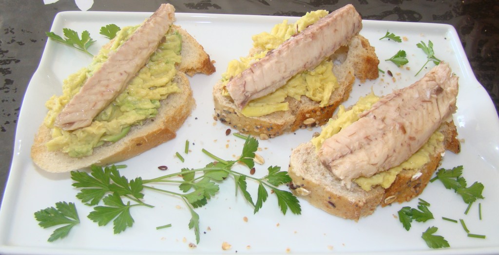 INGREDIENTES: rebanadas de pan, una lata de caballas en aceite de oliva virgen y un aguacate.