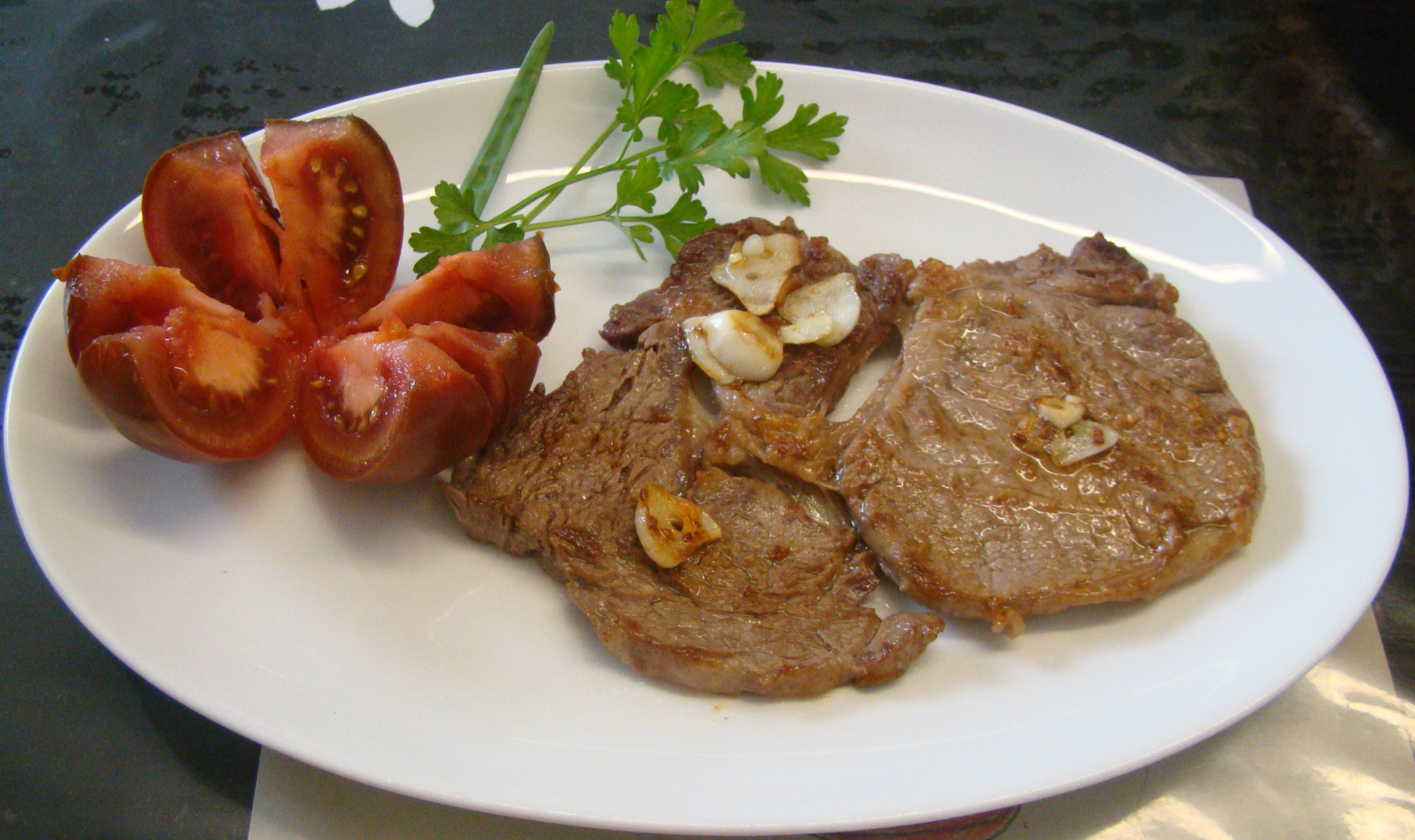 PREPARACIÓN: ponemos en una sartén ya caliente la carne, encima: el aceite, los ajos y la sal, asamos a fuego medio, 3-4 minutos por cada lado, o al gusto. Acompañamos con tomate.