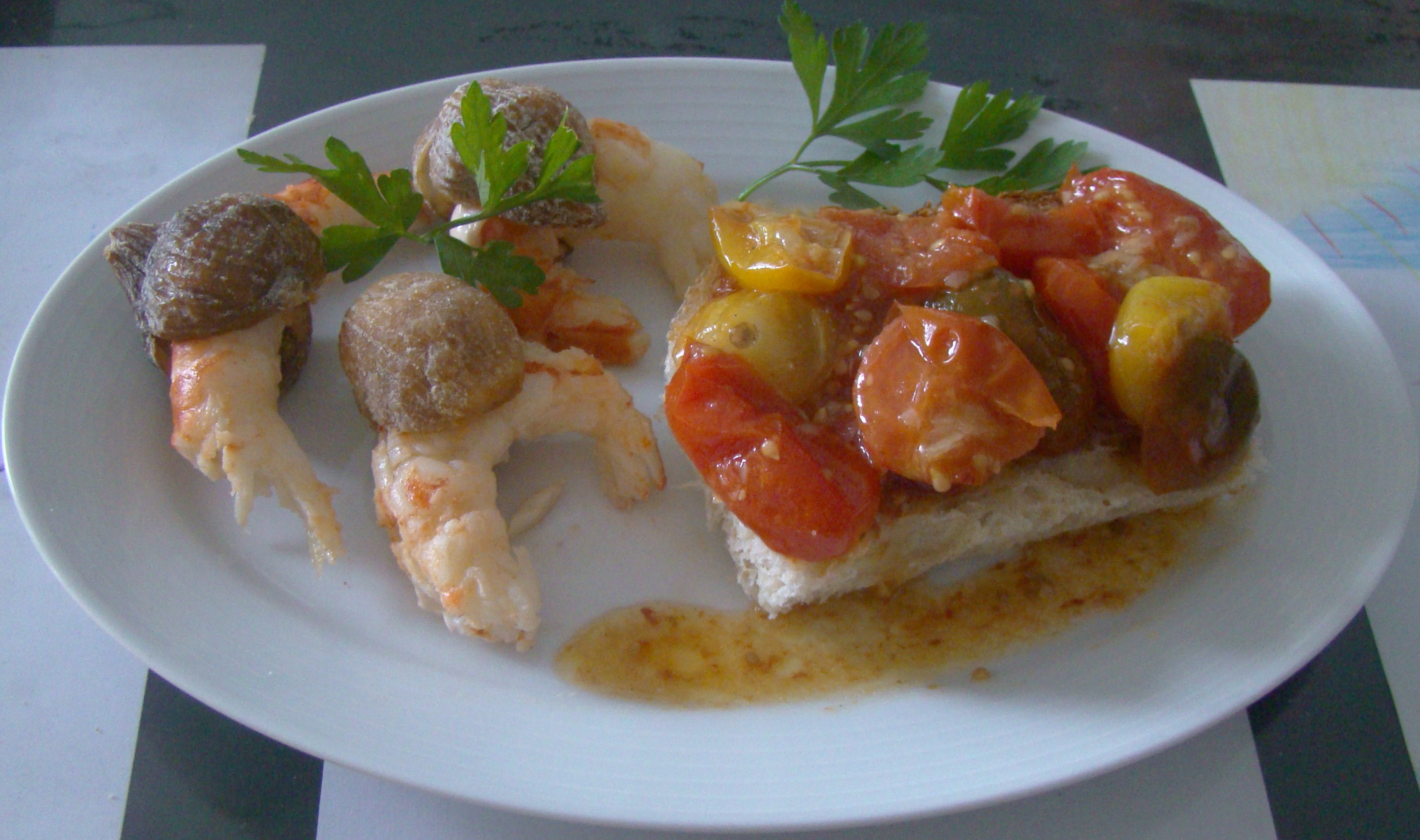 INGREDIENTES: 1 kilo de gambones, un puñado de higos pasados (opcional), pan para tostar, 800 gramos de tomates cherry, albahaca fresca, 1 diente de ajo, aceite de oliva virgen extra, sal pimienta al gusto y vinagre balsámico.
