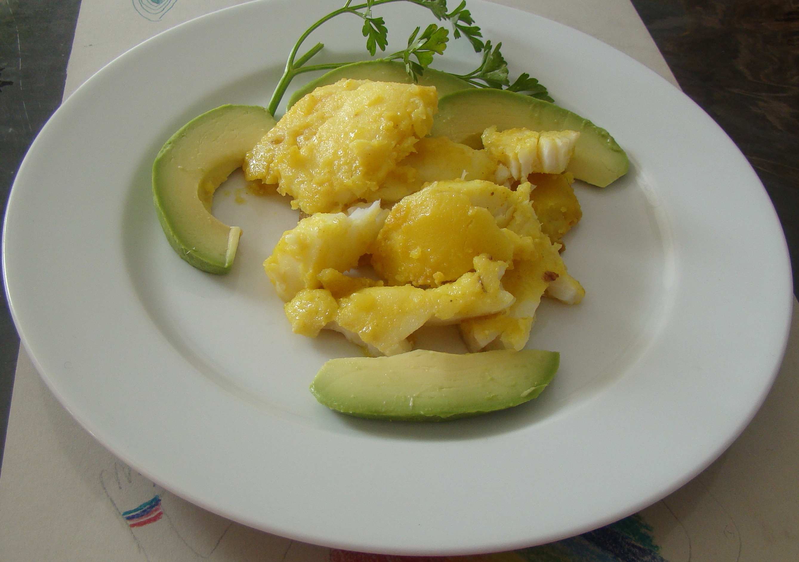 INGREDIENTES: 2 lomos de bacalao, 4 papas, 1 cucharadita de cúrcuma, 1 cucharada de aceite de oliva, 1 aguacate y sal al gusto.