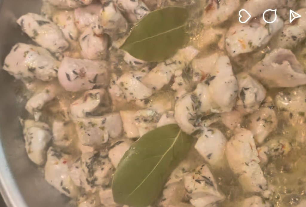 INGREDIENTES: 2 pechugas (cortadas en trocitos), 1 cucharada de aceite de oliva, 1 cucharada de Brandy, 1 cucharada raza de azafrán, orégano, tomillo y sal al gusto.
