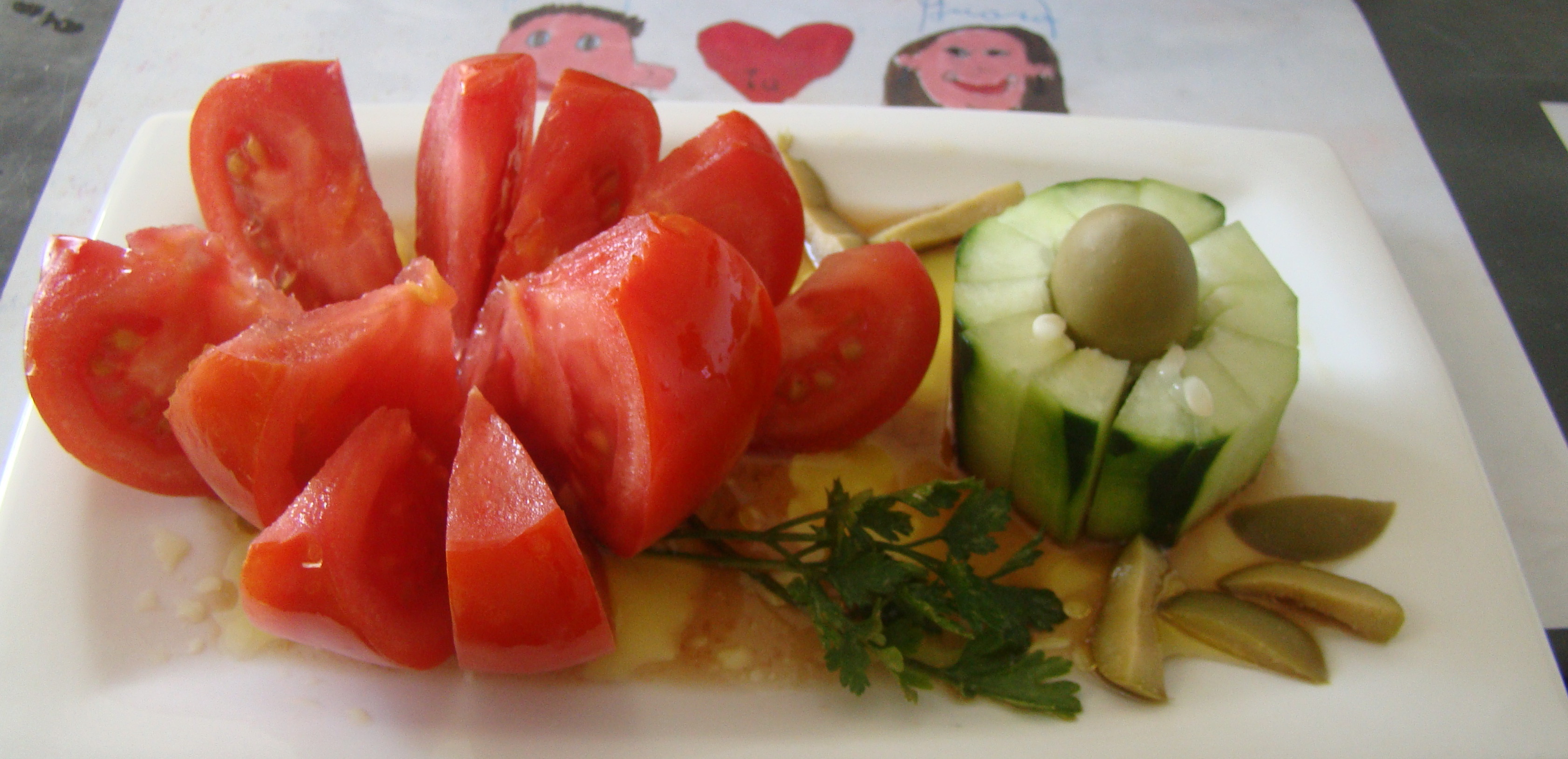 INGREDIENTES: 1 tomate, 1 pepino, aceitunas, aceite de oliva virgen y vinagre.