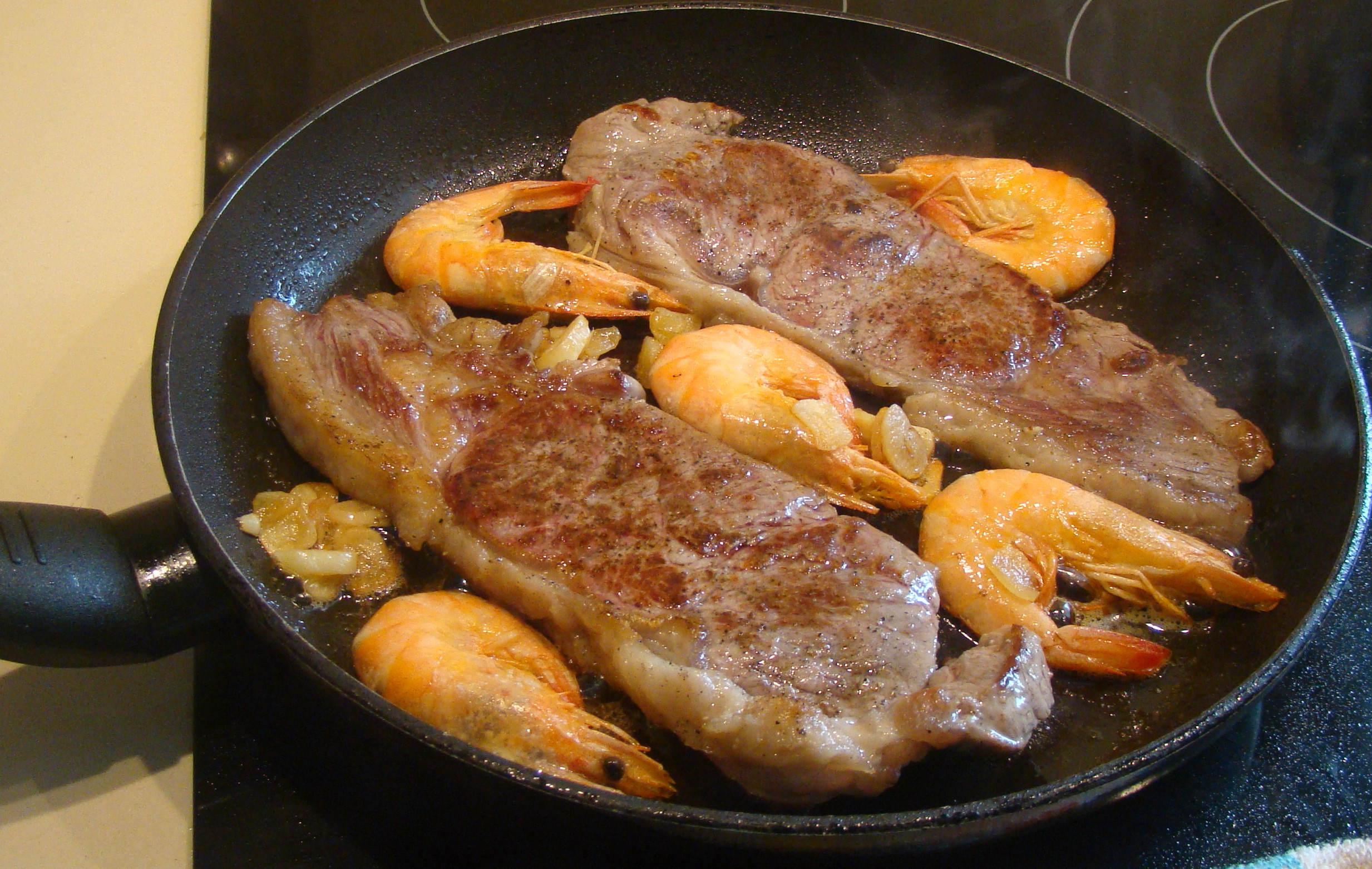 INGREDIENTES: 2 filetes de entrecot añejo, 5 gambas, 1 cucharadita de aceite de oliva virgen, 4 dientes de ajos y sal al gusto.