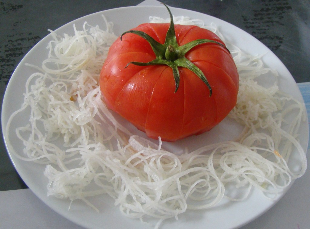 PREPARACIÓN: pelamos y cortamos la remolacha en tiras muy finitas , el tomate lo marcamos y al momento de servir lo abrimos y al gusto de cada comensal el aceite y el vinagre.