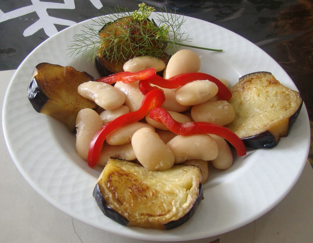 INGREDIENTES: 150 gramos de judías blancas, 1 berenjena , 1 cucharada de aceite de oliva y sal al gusto.