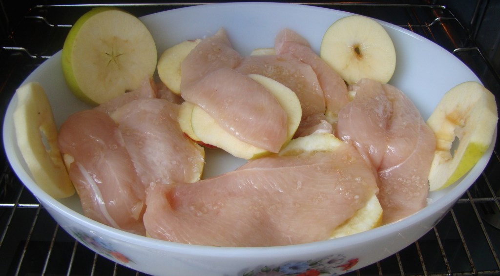 PREPARACIÓN: en una bandeja de horno ponemos la manzana cortada en rodajas, el limón y encima la pechuga. el aceite, la sal y horneamos 15 minutos a 180c .