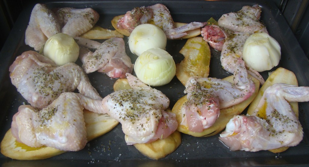 PREPARACIÓN: en la bandeja del horno ponemos las berenjenas y encima las alitas, las cebollas enteras, el orégano, el aceite, calentamos el horno a 180º C. Dejamos 15 minutos, comprobamos que están y sacamos.