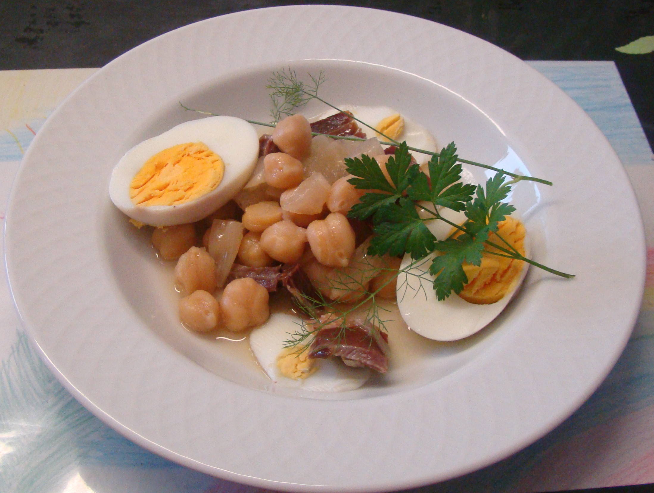 INGREDIENTES: 1/2 vaso de garbanzas, 8 judías blancas, un puñado de trocitos de jamón serrano, 1 cebolla blanca, 2 dientes de ajo, sal al gusto y huevos duros.