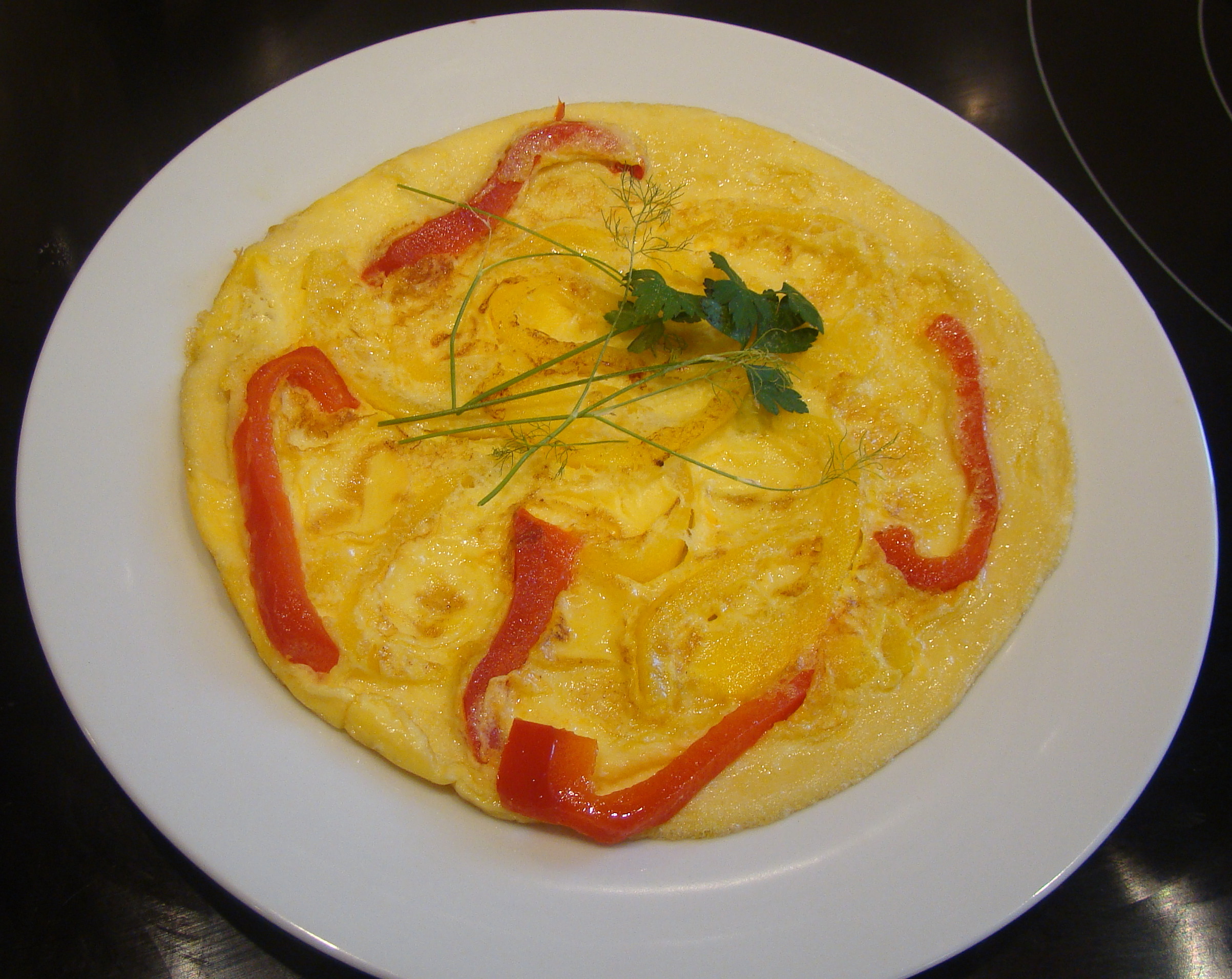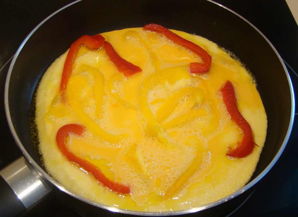 INGREDIENTES: 2 huevos, 1 trocito de pimiento amarillo y pimiento encarnado, una cucharadita de aceite de oliva virgen y sal al gusto.