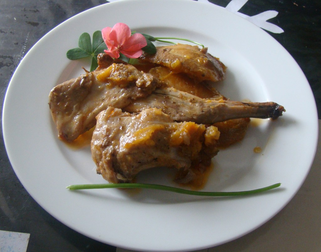 INGREDIENTES: 1 kilo de conejo, 1 cucharada de aceite de oliva, 2 batatas, 1 cucharadita de orégano, 1 cucharada de brandy, 1 cucharadita de tomillo, 1 cucharadita de comino, 1 cucharadita de cúrcuma sal al gusto.