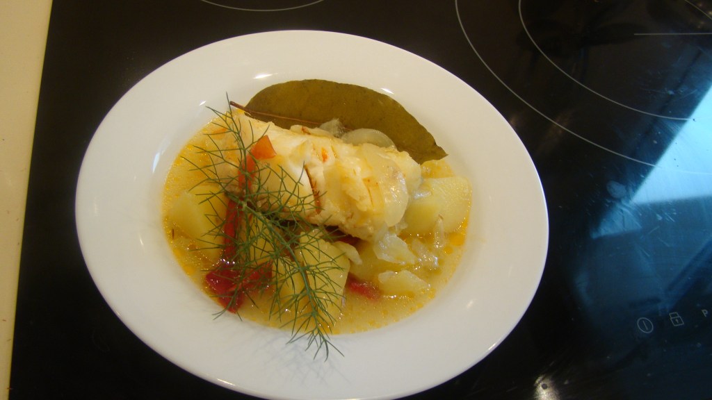 PREPARACIÓN: ( el bacalao es fresco congelado) dejamos en la nevera toda la noche. Hacemos un sofrito , con el aceite, los ajos , la cebolla, el pimiento y las papas, el laurel, añadimos 2 vasos de agua y cuando estén las papas añadimos el bacalao un hervor apagamos y dejamos reposar unos minutos.