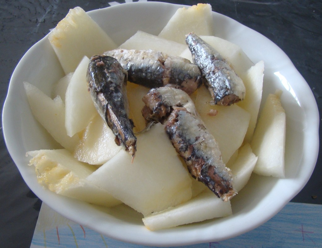 PREPARACIÓN: pelamos el melón y cortamos en trozos, añadimos las sardinas . La combinación es deliciosa.