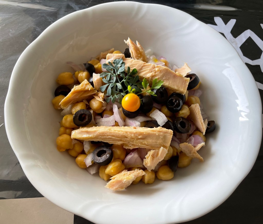 INGREDIENTES: un vaso de garbanzas, 1 cebolla, 1 lata de bonito en aceite de oliva virgen, 1 lata de aceitunas negras y aceite y vinagre al gusto.