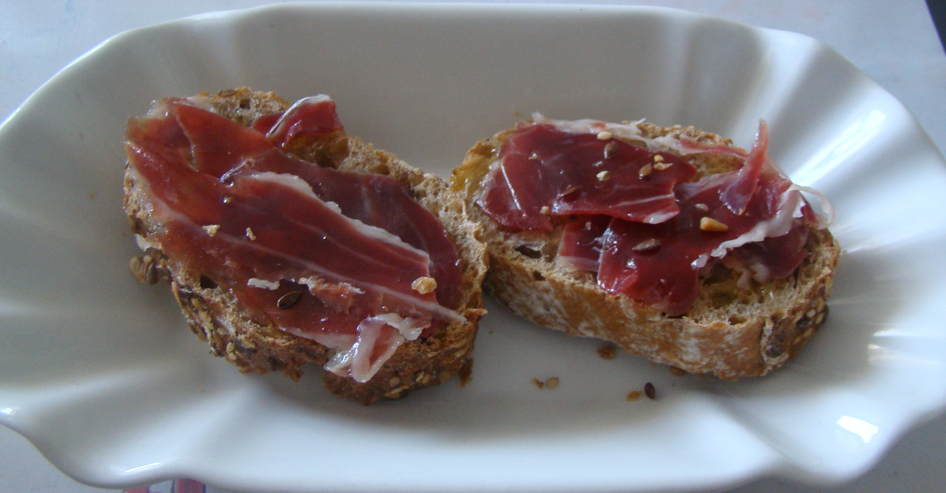 INGREDIENTES: pan de semilla, una cucharadita de aceite de oliva virgen y jamón serrano.