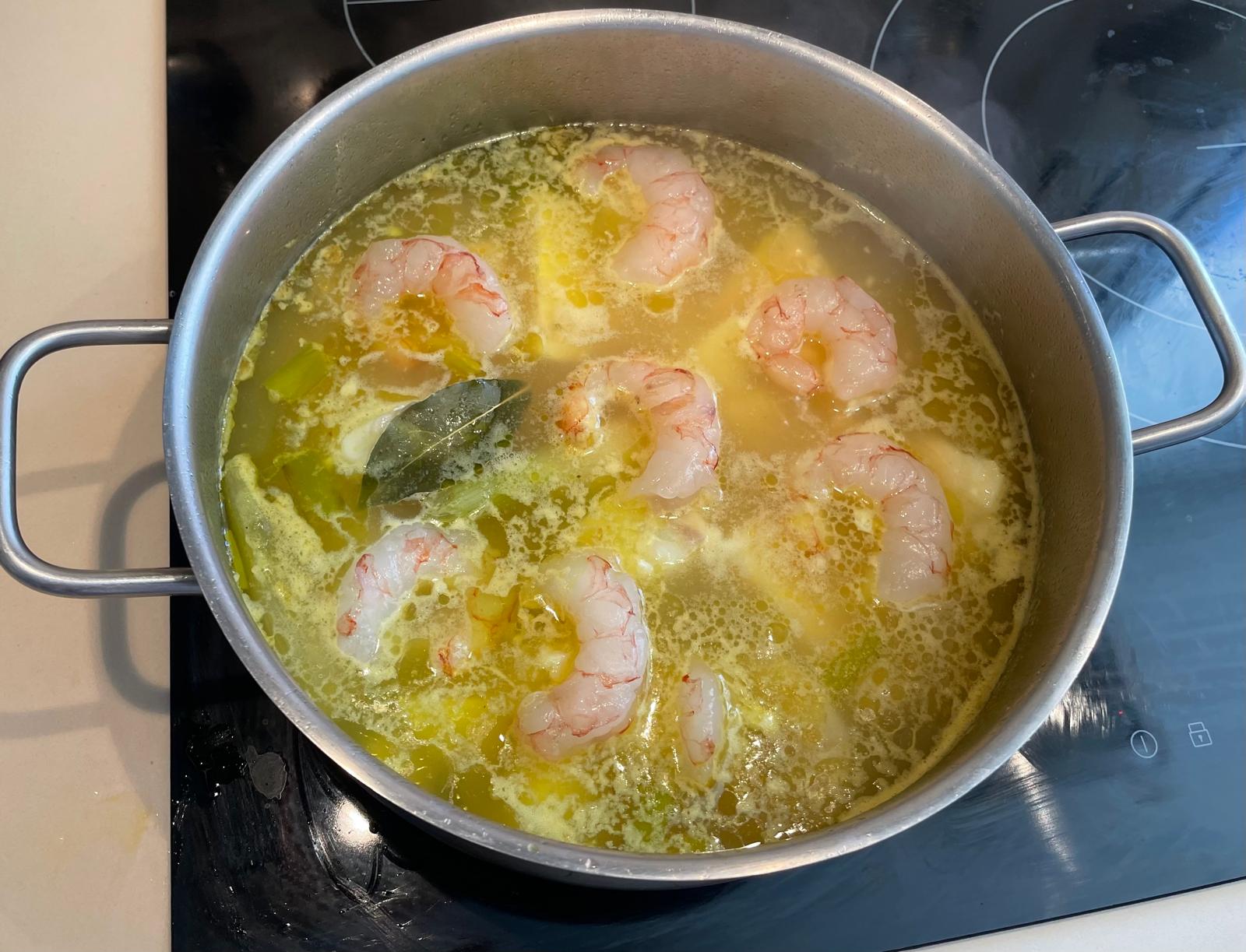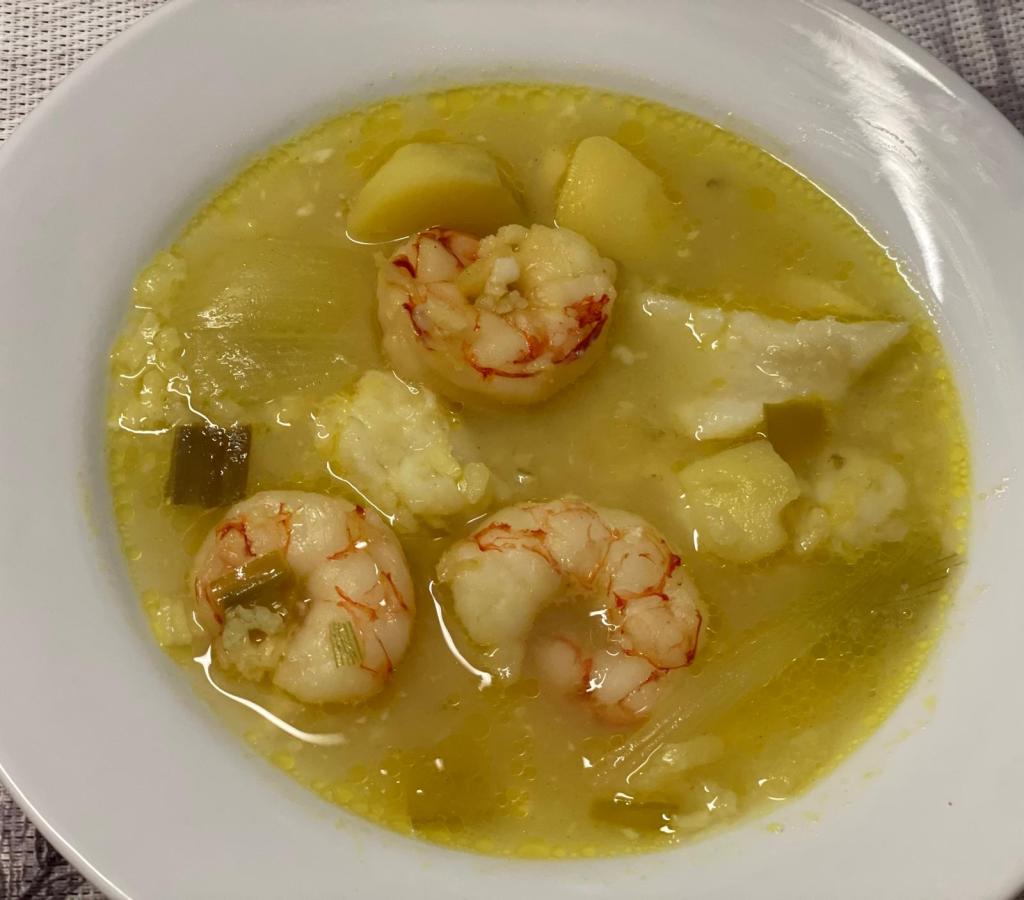 INGREDIENTES: 4 ajos, 1/2 ajo puerro, 8 papas medianas, 2 batatas pequeñas, 400 gramos de gambones, 1 lomo de bacalao en trozos, 1 cucharada de aceite de oliva, agua, 1 cucharadita cúrcuma y sal al gusto.